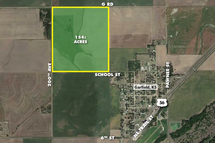 154 +/- acres of agricultural land in Garfield, Kansas! The tenant farmer on this property planted wheat that will be harvested in June. Farmer and seller have a 1/3 to 2/3 agreement. This property is zoned Agricultural. Mineral rights transfer to buyer.