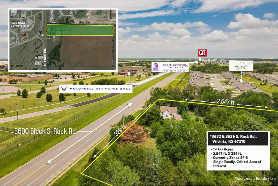 ONLINE ONLY!!!What an amazing opportunity to purchase almost 19 acres on Rock Rd. directly across from McConnell Air Force Base!!! Do not miss this opportunity to own real estate in the path of progress. The two homes, ponds and outbuildings havenot previously been offered on the market for decades. Each home has a curb cut off of S. Rock Rd., electric, shared well water, and a shared lagoon. The property sits nestled in with trees near the homes andopen field area in the immediate vicinitywith commercial, multifamily, and residential expansion surrounding what was once a farm. Just minutes from McConnell, Cessna, Southwestern College, Derby, shopping centers along Rock Rd., Webb, and Greenwich, and located in the Derby School district, this is a must-see!!!