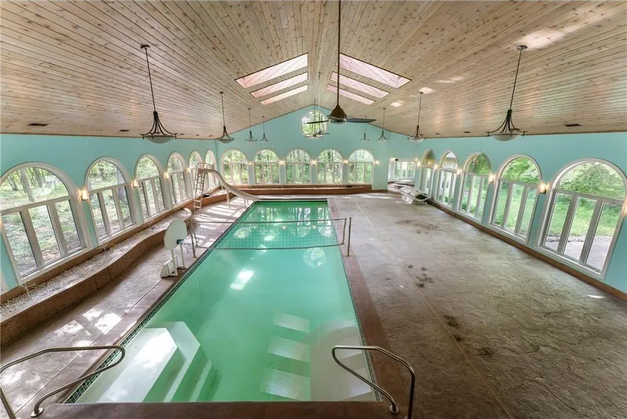 The standout feature is a 45×65 indoor pool wing with a heated in-ground pool, hot tub, sauna, full second kitchen, and bathroom—perfect for year-round enjoyment or extended stays. Very desirable floorplan with 3 bedrooms on upper level including the ultimate primary suite with attached office/nursery. High ceilings, hardwood and tile flooring, natural light, wonderful views, and 2 cozy fireplaces make this a spacious yet cozy home. Secondary primary suite is yet another bonus, particularly for multi-generational living.