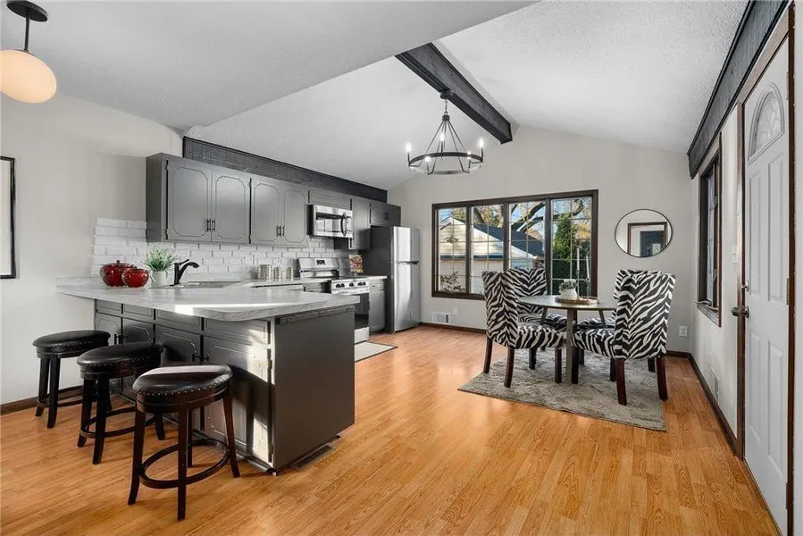 This beautifully refreshed 3-bedroom, 2-bath home combines original character with modern updates in a fantastic Saint Paul location—just blocks from Lake Phalen and Keller Regional Park. Step inside to a bright and inviting living room featuring newly refinished hardwood floors that flow seamlessly into an incredible vaulted kitchen & dining space. This impressive area offers an abundance of cabinetry—including a full wall of cabinets with a built-in desk— expansive countertop space, new appliances, and room for an oversized dining table. Conveniently located door leads directly out to the fully fenced, flat backyard and brand-new deck—perfect for relaxing or entertaining. The main floor also includes a large 23x12 bedroom and a beautiful fully tiled bathroom. Upstairs, you’ll find two large bedrooms filled with charm, thanks to the slanted ceilings and cozy nooks, along with a convenie...
