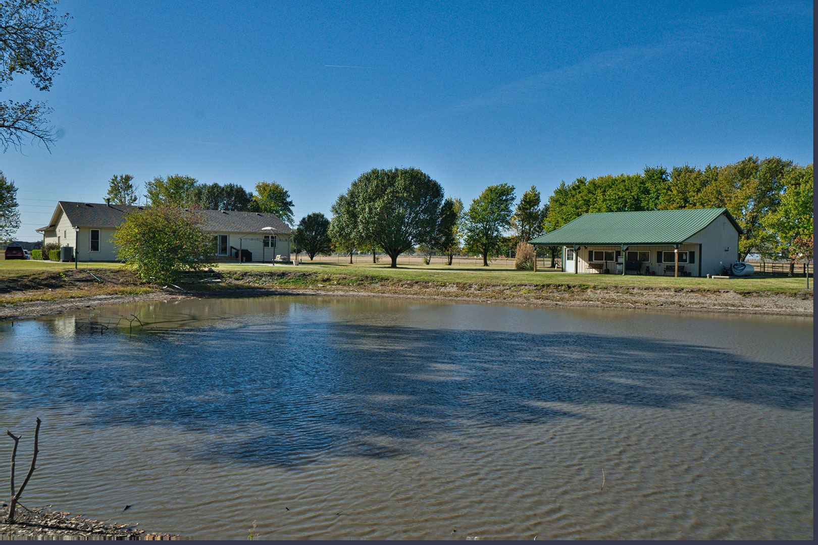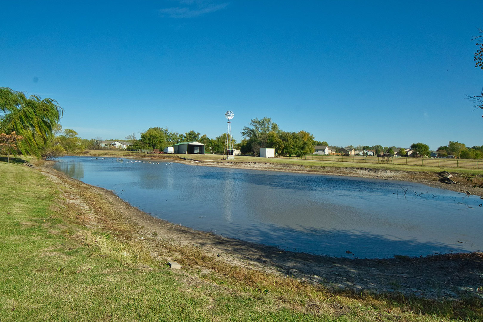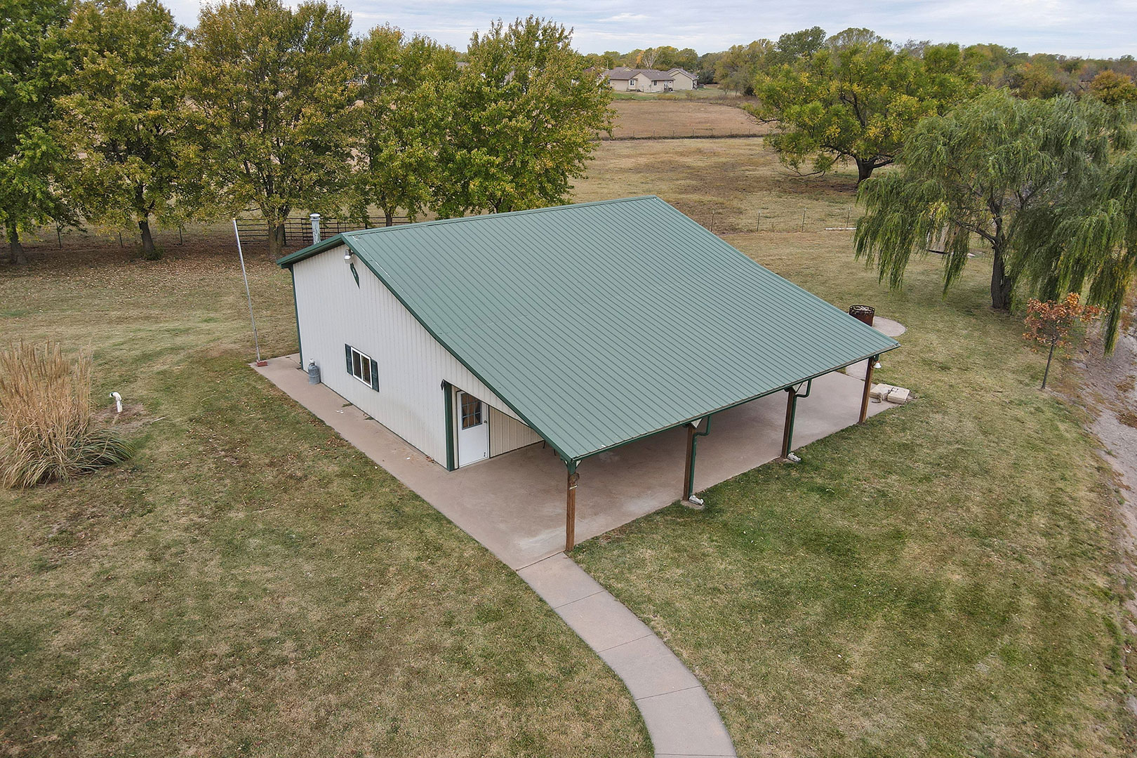 Incredible 20 +/- acre tract just outside of Wichita city limits, just east of West Street right on 47th Street. This wooded acreage has a private pond and serveral outbuildings including an impressive 36 x 30 steel building with a 36 x 15 covered patio overlooking the pond and windmill. This building is insulated with central heat and air with its own propane tank, and a small kitchen set up, providing the potential for additional living quarters. The property is set up for horses and cows with pipe fenced corals and additional sheds for up to 6 stalls. The exterior of the home features a covered entry, attached 2-car heated garage, sidewalks, and a large patio area viewing towards the pond, perfect for entertaining.