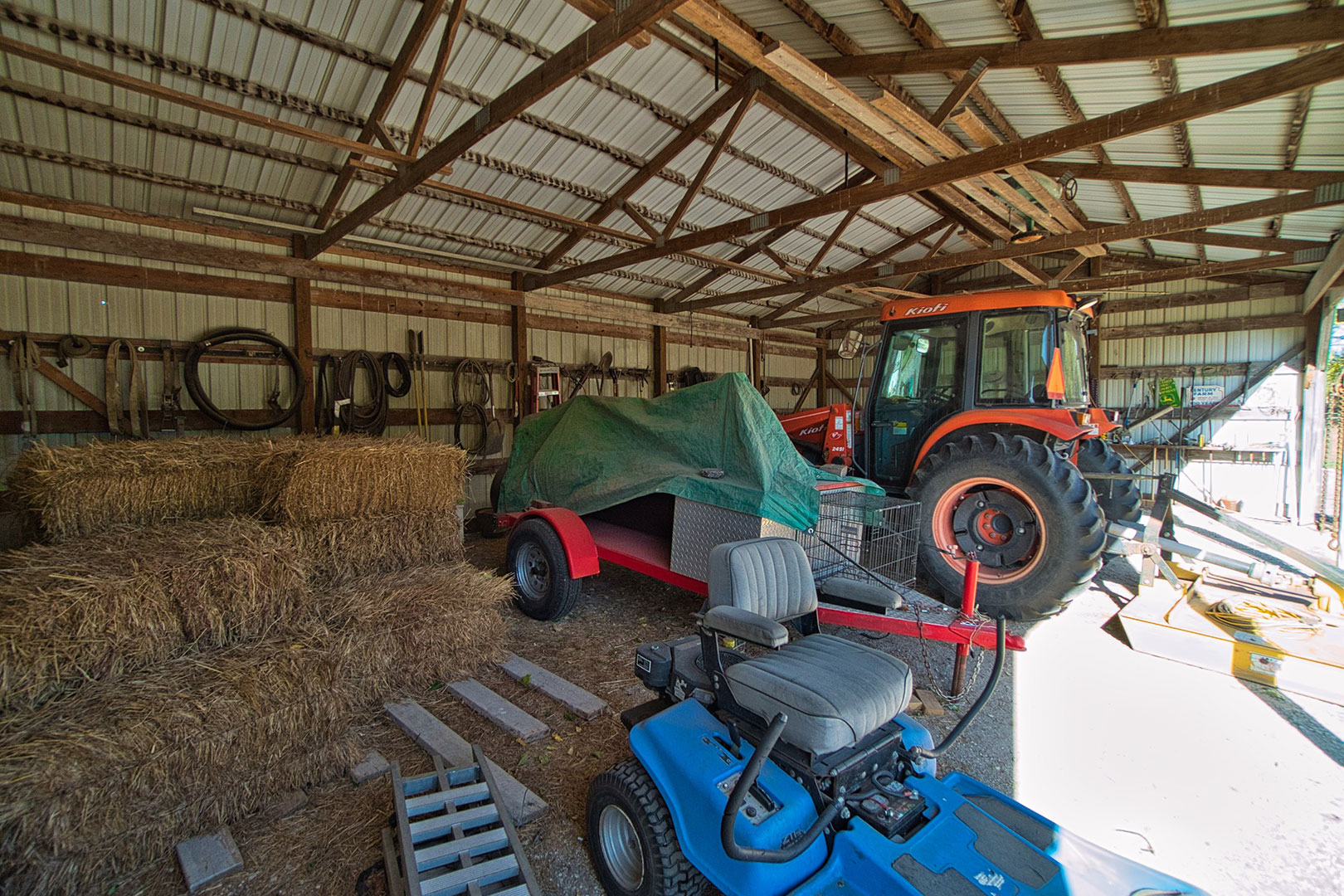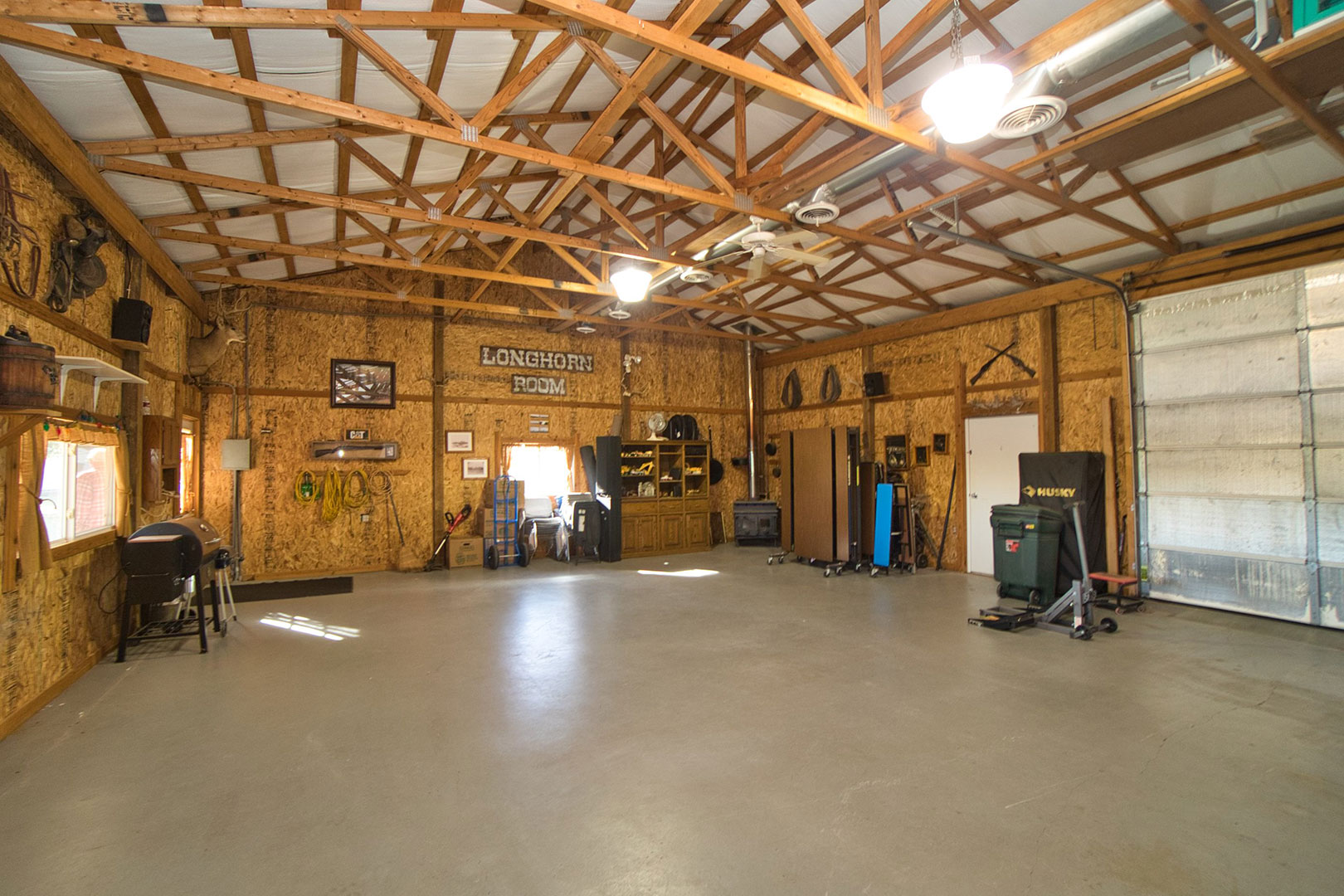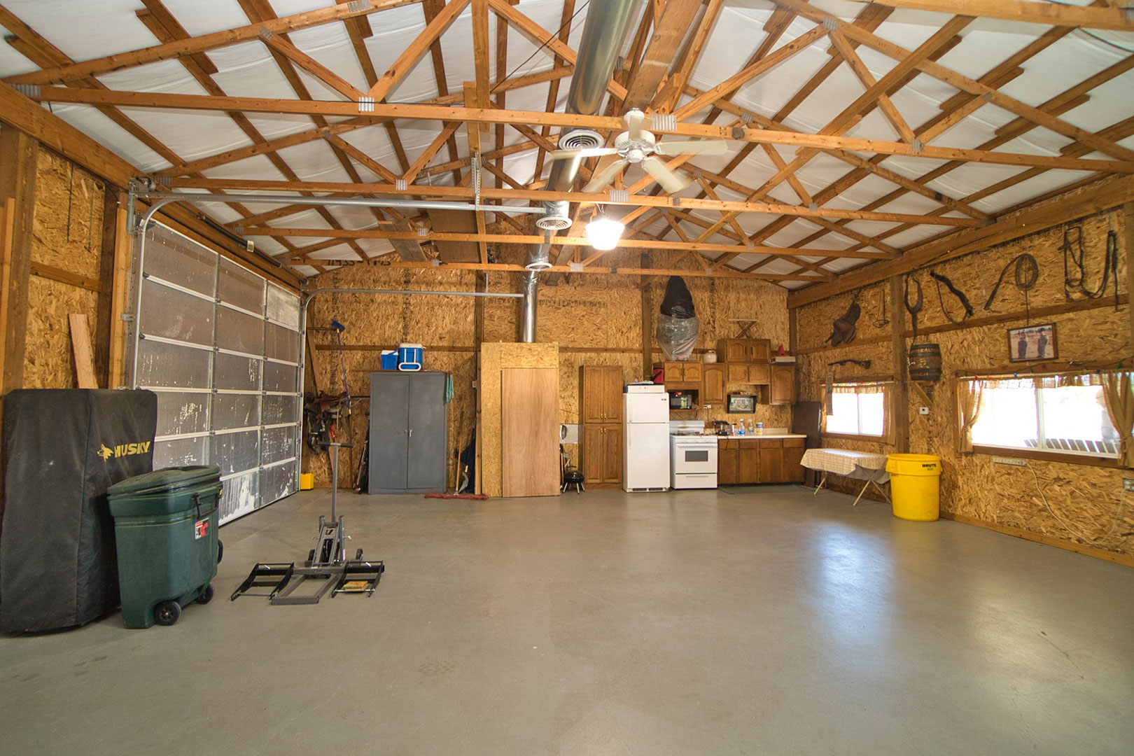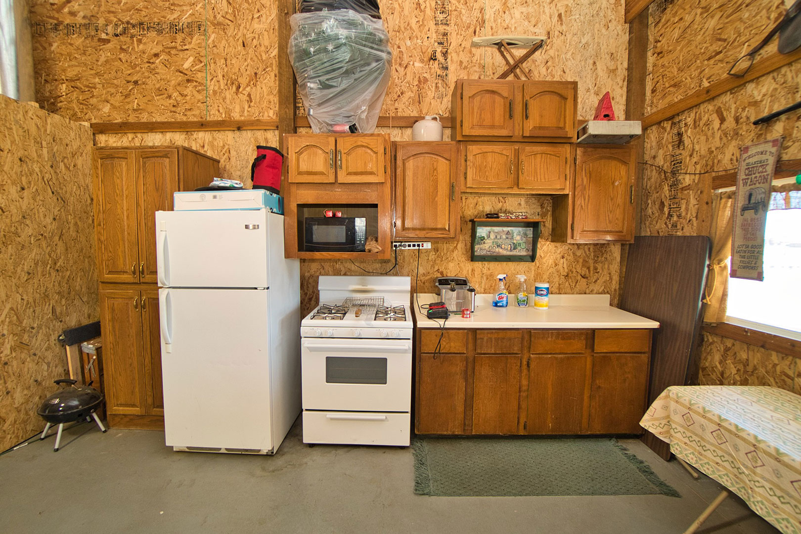 36 x 30 outbuilding with a 36 x 15 lean-to overhang. Wood and gas burning stove & kitchen area with refrigerator.