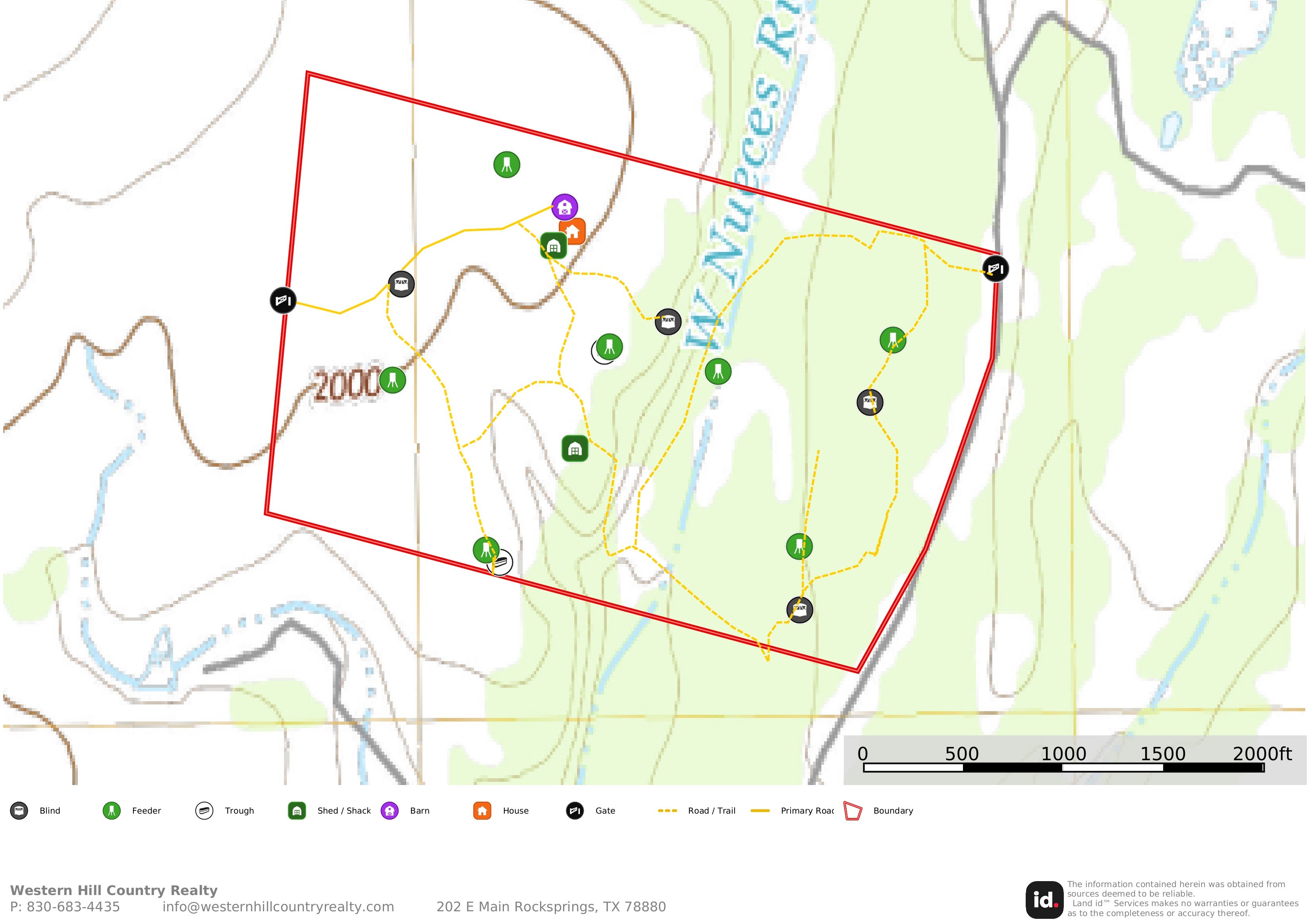 The land itself is diverse and scenic. The front portion of the property is level to gently rolling, offering fertile topsoil and open areas shaded by massive live oaks. From the high points, enjoy sweeping views of the dry creek bed of the west prong of the Nueces River, which winds through the property and serves as a constant travel corridor for wildlife. The terrain also features large live oak thickets, grassy bottoms, and scattered rock outcroppings.