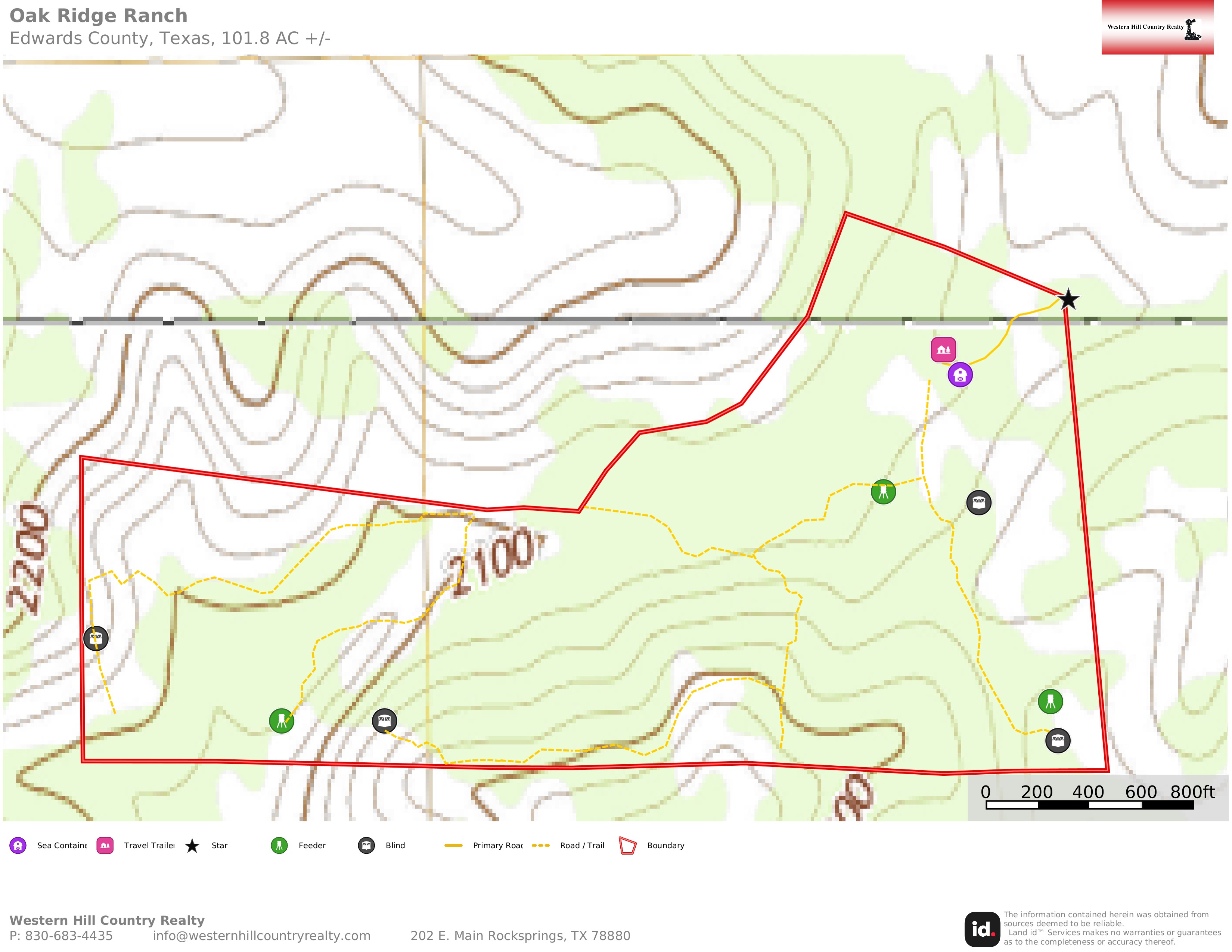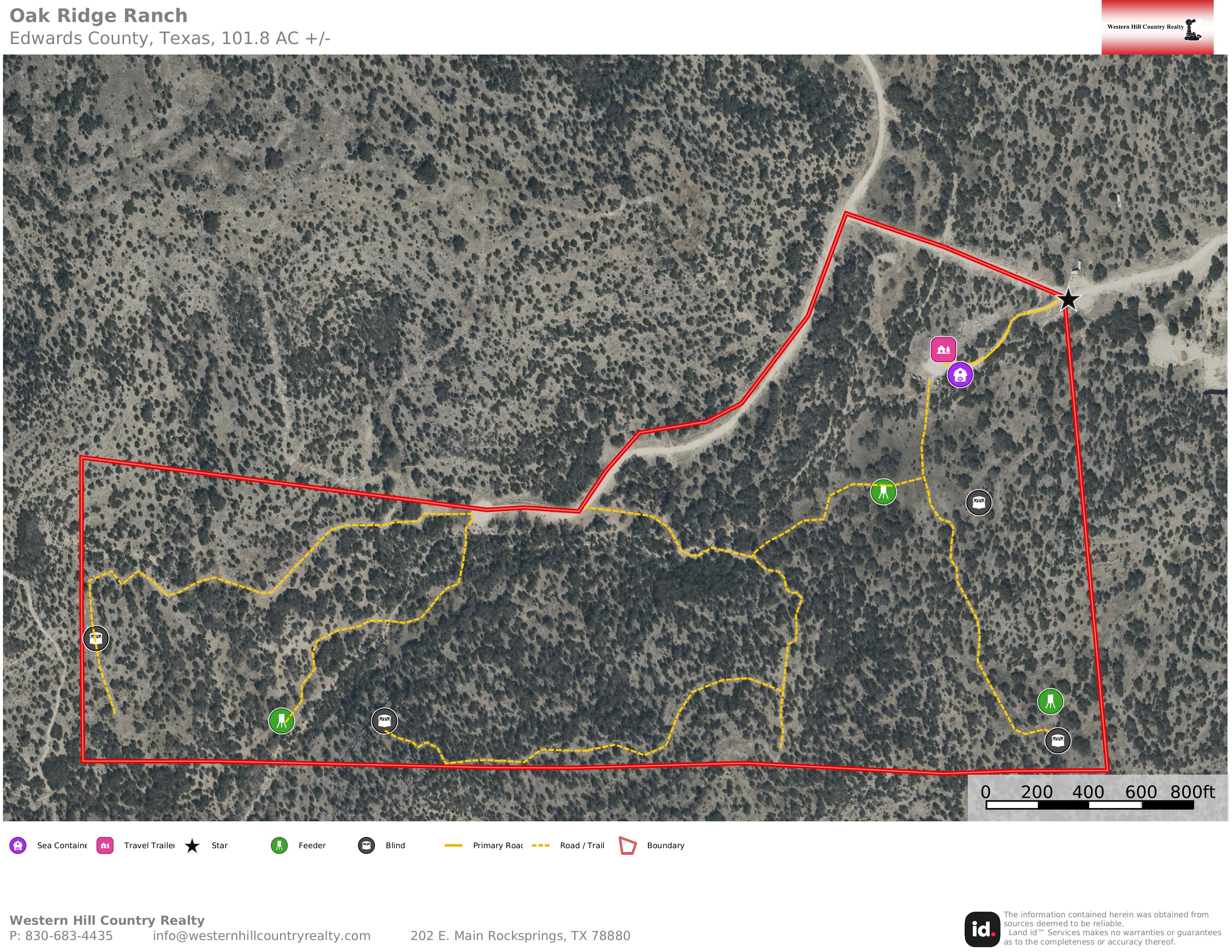 Oak Ridge Ranch spans +/-101.32 acres in the rugged beauty of western Edwards County, Texas, offering both privacy and prime hunting opportunities. Situated near the end of the road, this property provides a sense of seclusion while still offering essential comforts with electricity and water already in place. The ranch includes a 34-foot Open Range travel trailer in good condition, perfect for weekend getaways or extended stays, along with an 8x40-foot sea container for secure storage. A large deck serves as the ideal gathering spot, complete with a fire pit and outdoor cooking area for relaxing evenings under the stars.