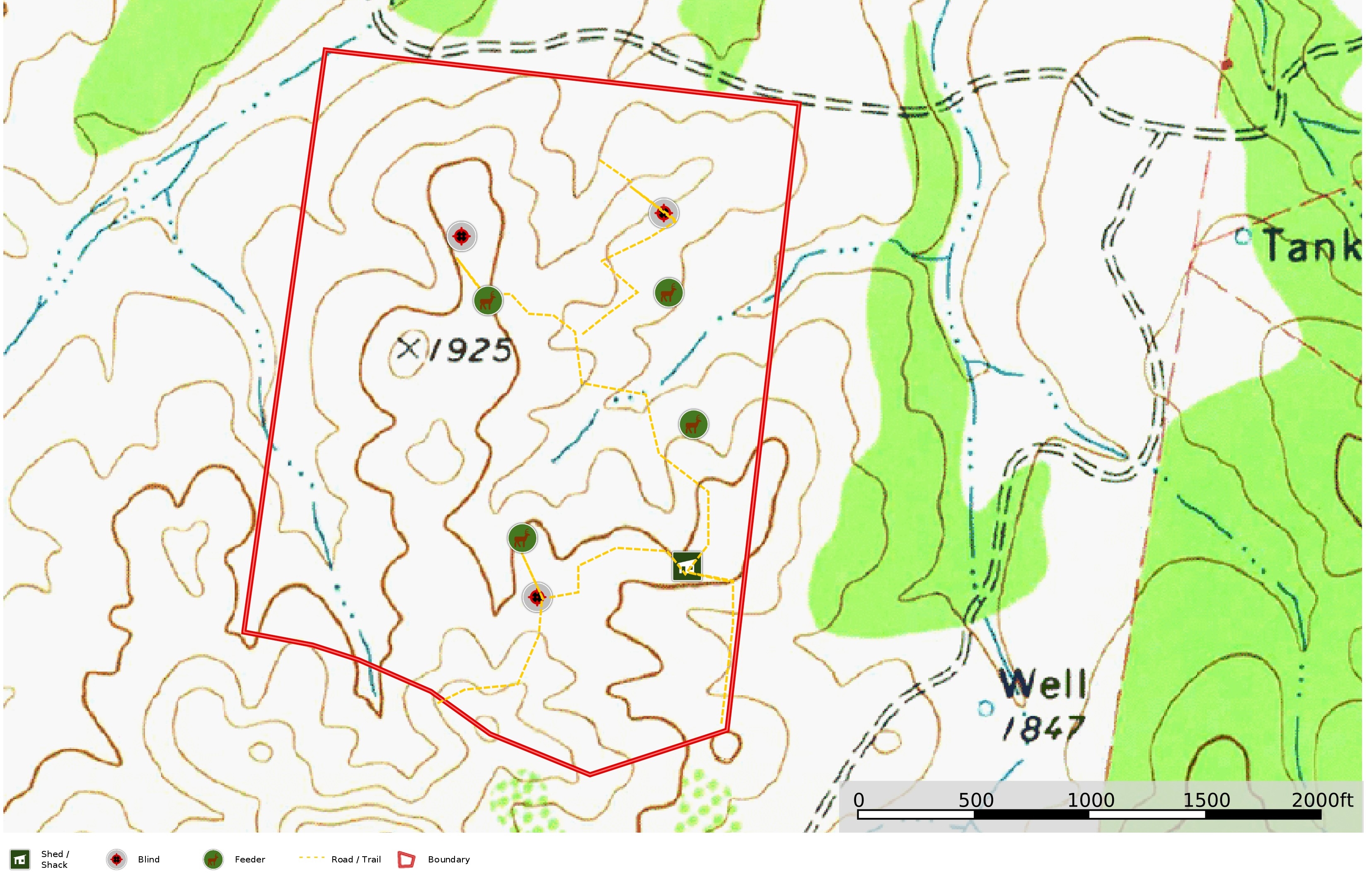 Trail system all throughout the property leading to 4 areas with blinds and feeders