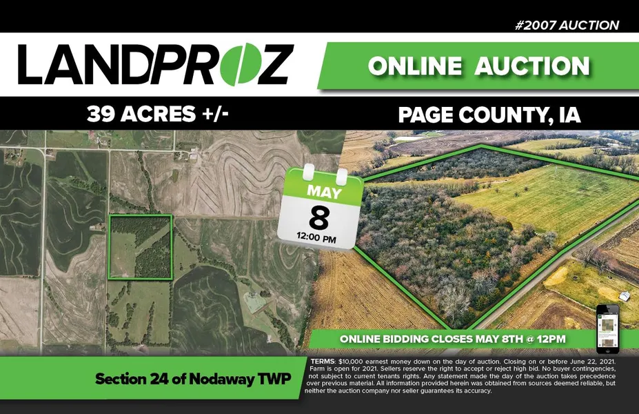 $10,000 earnest money down on the day of auction. Closing on or before June 22, 2021. Farm is open for 2021. Sellers reserve the right to accept or reject high bid. No buyer contingencies, not subject to current tenants rights. Any statement made the day of the auction takes precedence over previous material. All information provided herein was obtained from sources deemed reliable, but neither the auction company nor seller guarantees its accuracy.