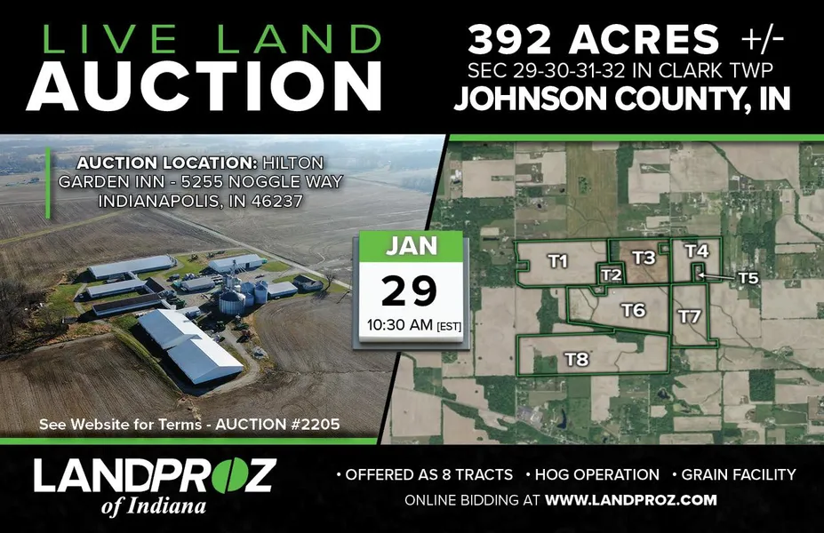 Manure and fertilizer applications give the tillable land top nutrient levels. This highly productive land can produce yields of 250 bushel per acre for corn and 70 bushel per acre soybeans. With minimal investment to the barns, you could be up and running a full farrowing operation. The grain facility has plenty of capacity to handle the crop that comes in from the tillable land. The MRS Pork Eastburn Brothers Farm lays close to the best soybean and corn markets in the state. Bunge Morristown and Poet Ethanol Shelbyville are both within 25 miles. 392 +/- Deeded acres with 342+/- being tillable, makes this farm 87% tillable. Also included are 2 homes.