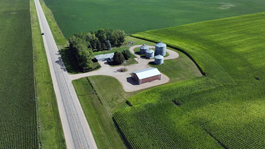 Additionally, there is a 40' x 60' machine shed, accompanied by 4 grain bins, that open up rental income opportunities. A mature grove to the North, complemented by a newly planted line of evergreens, enhances the scenic beauty of the property!