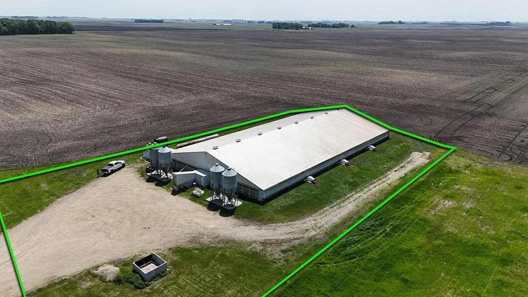 Located in Winnebago County, just North of Thompson, IA. This barn sits on 3.66 +/- Acres, has single phase electricity, and a 50 KW Generator. It was built in 2007, is a 101' x 192' wean to finish barn, and holds 2,400 head. This barn has a 900,000 gallon pit with an annual production of 517,080 +/- gallons. Records show manure tests of 59.1lbs Nitro/1,000gal [on average].