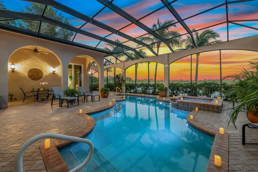 Searching for breathtaking lakeside views and spectacular sunrises alongside luxurious surroundings in the Fiddler's Creek community≠ Within its prestigious Bellagio neighborhood, discover a rare opportunity to own this immaculately maintained and upgraded home that offers an unparalleled blend of sophistication, comfort and resort-style living. With breathtaking vistas, an expansive enclosed patio featuring a pool and spa, and a clear skyline for stunning sunrises, this is the ideal retreat for those seeking elegance and tranquility. A paver driveway, tile roof and lush, meticulous landscaping add to the home's outstanding curb appeal. Step into a light-filled, contemporary masterpiece where tile flooring, soaring ceilings, and wide windows seamlessly blend to create a warm and open ambiance. The generous three-bedroom, 3.5-bath layout, a rarely available Marguerita floor plan, offers a...