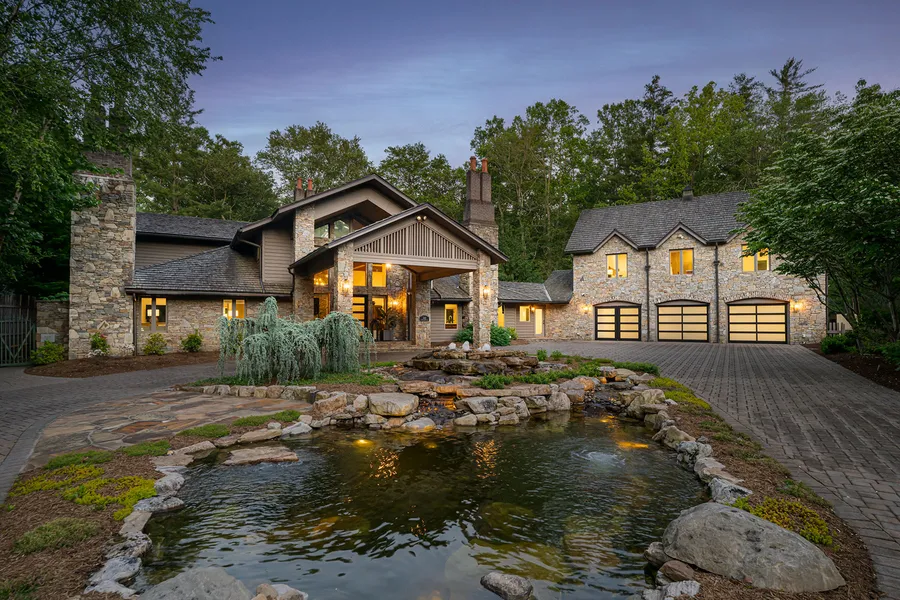 Discover unparalleled serenity with this private estate nestled on over four acres of curated gardens, open meadows and fern-covered forests. This enchanting property features a storybook conservancy, two charming guest cottages and an exquisite main residence. A stunning stone wall lines the property, ensuring privacy and creating an oasis that feels worlds apart—yet it's conveniently located 15 minutes from the heart of downtown Asheville. Situated within the prestigious gates of The Ramble, this estate offers a rare opportunity: the privacy and security of a gated community without the architectural or usage restrictions and currently no rental restrictions. The main residence is the ultimate mountain retreat, showcasing soaring post-and-beam ceilings, dramatic floor-to-ceiling stone fireplaces, an exquisite primary suite, a chef's kitchen, five guest suites and over 2,000 square feet of outdoor living space with forest views. The main residence was meticulously renovated in 2022.