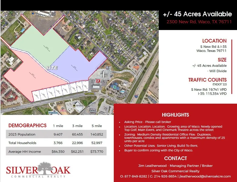 Contact Jim Leatherwood at Silver Oak Commercial Realty for pricing, site plans, demographic reports, and to schedule a tour. This is a rare chance to secure a high-visibility site in one of Waco’s most dynamic growth areas.