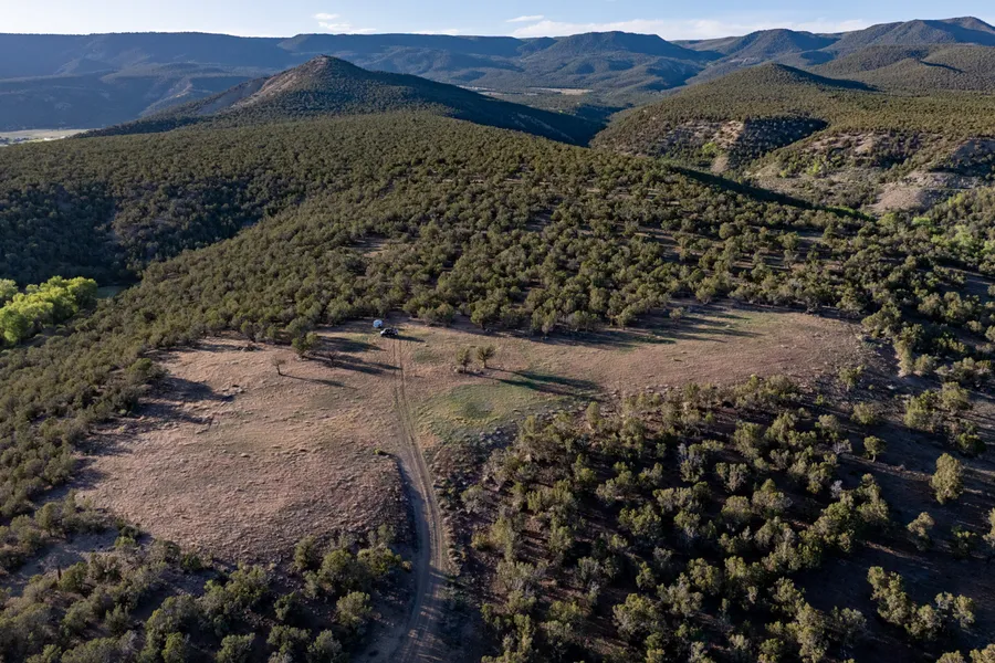 A steel bridge crossing Fire Mountain Canal leads you onto the southern portion of the property, where a short drive climbs to a plateau building site with panoramic views of Mt. Lamborn, Lands End, the Raggeds, and the West Elk Mountains — one of the most scenic vistas in the region. This area includes two domestic water wells, and DMEA power will be brought to the property, making development straightforward. The land is covered in mature pinion and juniper forest, with portions selectively hydro-axed for fire mitigation, improving forest health and usability.