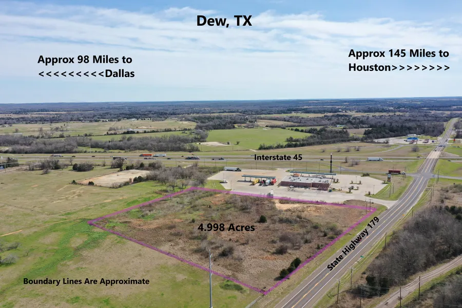 Approximately 5 ACRES Located in DEW, just off of Interstate 45 Between Dallas and Houston Texas! Property is adjacent to Lucky J's Travel Center (Sonic, Valero) on the west side of I-45, EXIT 189. Highway 179 road frontage is 512.04'. On the east side of I-45 is Road Ranger (Wendy's & Subway) The business opportunities are endless! Retail, Manufacturing, Warehouse, Restaurant , & Lodging just to name a few. Great central location in Texas that is consistently growing as businesses continue to built along I-45.