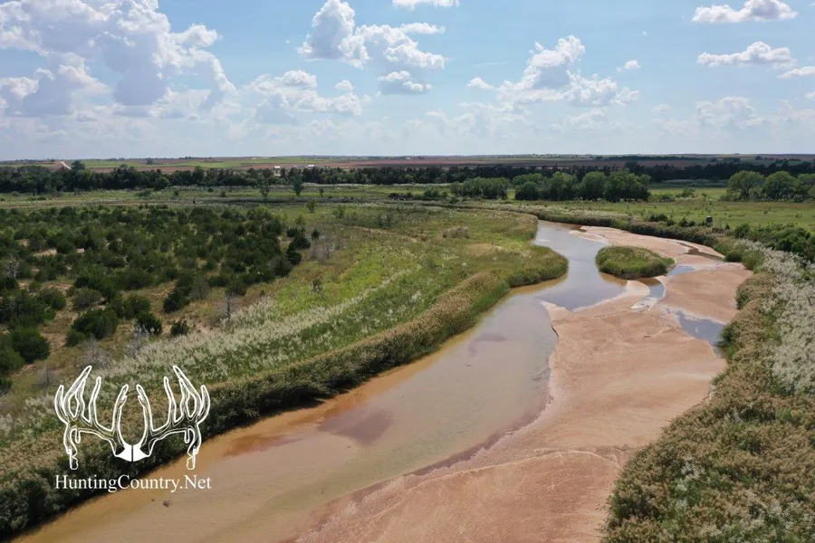 The Boss Game System 4x6 hunting blind on 8 tower is easily accessible and strategically placed on the High Ground to avoid spooking any wildlife. The farm is also complimented by a 300# spinner feeder. Overlooking the Canadian River Bottom. This small affordable farm has a lot of character and it hunts much bigger than it is.