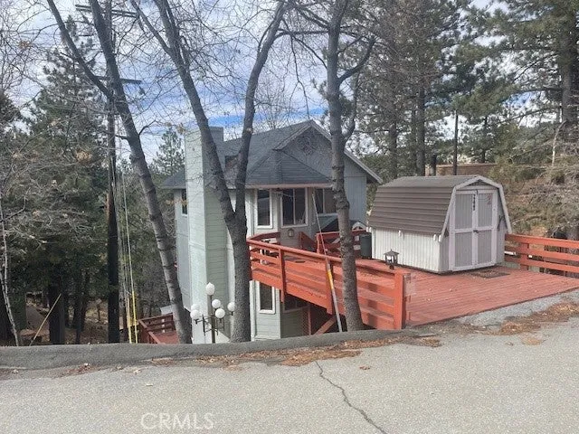 This well maintained home is in the mountain community of Arrowbear. Home includes the furniture. The beautiful Arrowbear lake is just up the road for fishing and swimming on those warm summer days. It's at an elevation of over 6,000 ft. The main home has 2 bedrooms and 1 1/2 baths. The living room has a wood burning fireplace. The kitchen is upgraded with granite counter tops, stainless steel sink and a breakfast bar. There is separate laundry area just off the kitchen with a stackable washer and dryer. The upstairs bedrooms are spacious. There is also a downstairs that can be used as guest quarters. It has a studio room and a 3/4 bath with a separate entrance. Both the upstairs main home and the guest quarters have their own patio decking. There are 3 storage units on the property. The one at the driveway has electricaal and generator hookups. There are 2 giant outdoor lamps worth $2,000 each that give off alot of light. The owner will consider leaving all furniture with an acceptable offer including appliances (washer, dryer, refrigerator and free standingoven/range). The property is only 30 minutes from Highland and the 210 freeway. AIRBNB ready.