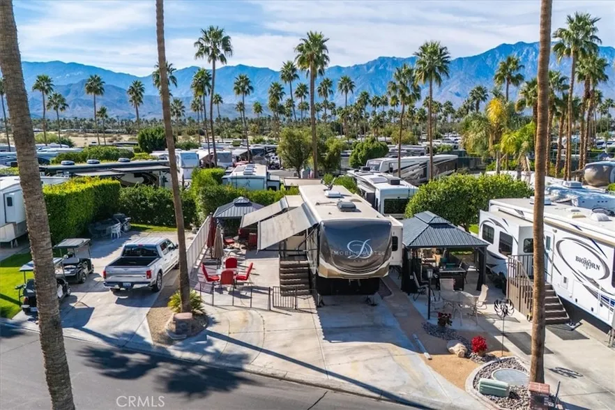 Beautifully expanded Lot 303 is located on the east side of Outdoor Resorts Palm Springs an All-Ages Active Resort Community. The lot features a newly constructed gazebo with electricity, curtain surround for privacy, tv mount and TV, a firepit table with 4 chairs and cushions, vinyl fencing on both sides and a 2018 DRV Mobile Suite Aire M-38, 39'11" in length, with custom wood steps w/storage & wood railing, soft side covers for lower part of fifth wheel. Interior Fifth Wheel Features Include: Corian countertops, center island, stainless steel farmhouse sink, 3 burner Furrion stove, convection microwave, molded tile backsplash with Jute edging, residential fridge/freezer with ice maker, pendant lights over the island, pantry, vinyl wood look flooring expandable wood table for 4, rear living room with 3 recliners, ceiling fan in living room, large windows let in the natural light, sleep number king size bed, 8 drawer dresser, 3 additional storage cabinets, Corian countertops in the bathroom with dual sink vanity, residential toilet, large shower area, stacked Splendide washer/dryer, large closet and plenty of storage space. Outdoor Resorts Palm Springs spans 137 beautifully landscaped acres and offers an unmatched resort lifestyle with 27 holes of executive golf, 10 tennis courts, 13 pickleball courts, 8 swimming pools, a fully equipped fitness center, sports bar (19th Hole), on-site salon/barber shop, caf , and two clubhouses with year-round activities, events, and entertainment. Whether you re seeking an active social scene or a peaceful desert retreat, this is more than a lot it s a lifestyle.