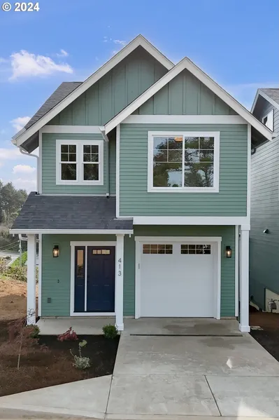 Nestled just moments from the shimmering shores of the Oregon coast, 413 NW 5th Street epitomizes coastal living at its finest, with Final Occupancy Certificates already issued. This brand-new construction home offers a harmonious blend of modern luxury and relaxed seaside charm. Step into 1,599 square feet of meticulously designed living space, where every detail speaks to comfort and sophistication. The main level features an inviting open floor plan with waterproof laminate flooring, seamlessly flowing from the spacious living area to a fully functional kitchen adorned with quartz countertops and Haven green painted cabinets. Stainless steel appliances, including a stove, microwave, and dishwasher, ensure both functionality and style, complemented by brushed gold fixtures throughout. Unwind and entertain effortlessly with two-story covered Trex decksone accessible from the expansive l...