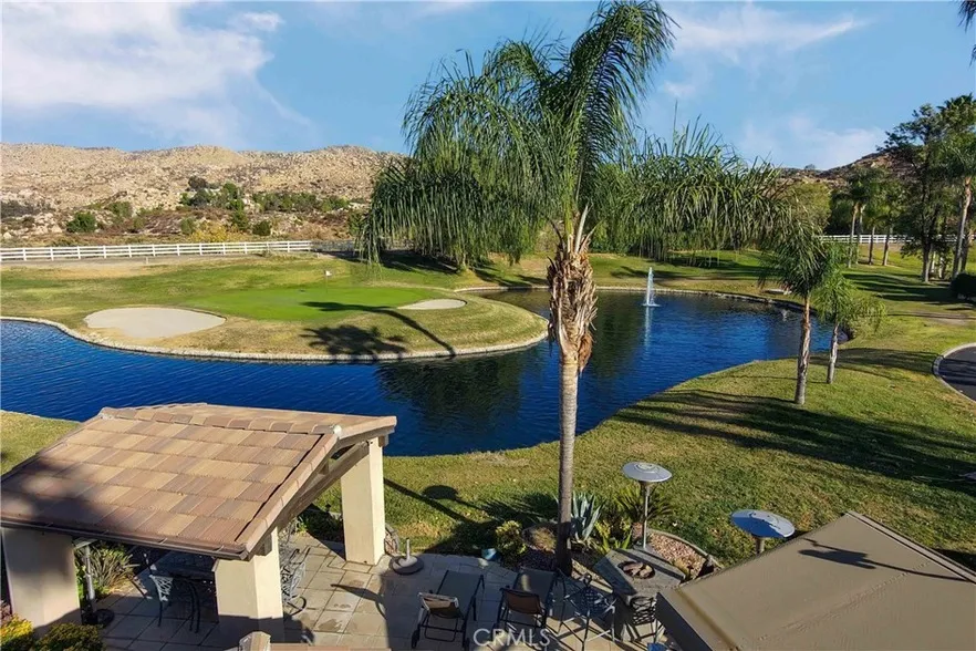 Check out the gated entry to this incredible waterfront property! If you ve been waiting for the lot with views, you just hit the lottery enjoy stunning mountains, water, sunrise skies, and a direct view of the 14th hole golf green... it truly doesn t get better than this. From the moment you arrive, you re welcomed by a gorgeous stack rock water wall entry framed with beautiful drought-resistant landscaping. Step through the gate and you re instantly greeted by a warm, inviting gathering area fully screened in for comfort and privacy complete with a fireplace and a fully stocked kitchen featuring a dishwasher, built-in BBQ, toaster oven, two water heaters, and tons of storage. The outdoor patio is a true entertainer s dream with a retractable awning, plus a complete setup including a washer and dryer, cooler, freezer, ice maker, and island refrigerator. And the gazebo dining area right next to the water is the perfect spot for unforgettable dinners, relaxing evenings, and peaceful mornings soaking in the serenity. This is one of those spaces you need to see in person to truly appreciate the experience. Financing available. Located inside Rancho California RV Resort, owners enjoy a premier lifestyle with a 14-hole executive golf course (free for owners), five pools and jacuzzi areas, tennis courts, pickleball courts, laundry rooms, dog park, horseshoe lawn, clubhouse, hiking trails, and an on-site restaurant all within a 24/7 guard-gated community. Live here full-time or rent out your space either way, you ll love the peace and quiet, just 25 minutes from Temecula Wine Country with no age restrictions. Come see this hidden gem for yourself!