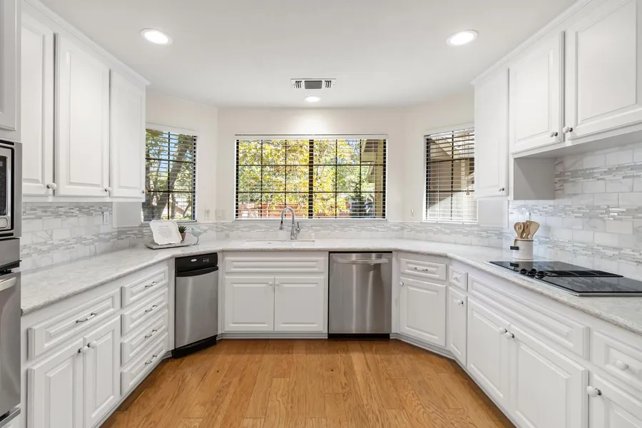 Immaculate and Inviting! This beautifully maintained 2-bedroom, 2-bathroom home offers the perfect blend of comfort, style, and convenience across 1,804 sq ft. A private gated courtyard welcomes you into the home, providing a charming and secure entry. Inside, the open great room seamlessly combines the living, dining, and kitchen areas, creating an ideal space for everyday living and entertaining. Gorgeous wood flooring, vaulted ceilings, and abundant natural light enhance the home's spacious feel. The inviting living area features a cozy gas-start fireplace that serves as a beautiful focal point. The kitchen is a chef's delight with white cabinetry, quartz countertops, stainless steel appliances including a JennAir cooktop, custom tile backsplash, and roll-out shelves for easy organization. The primary suite offers mirrored closet doors, direct backyard access, and an en-suite bath wit...