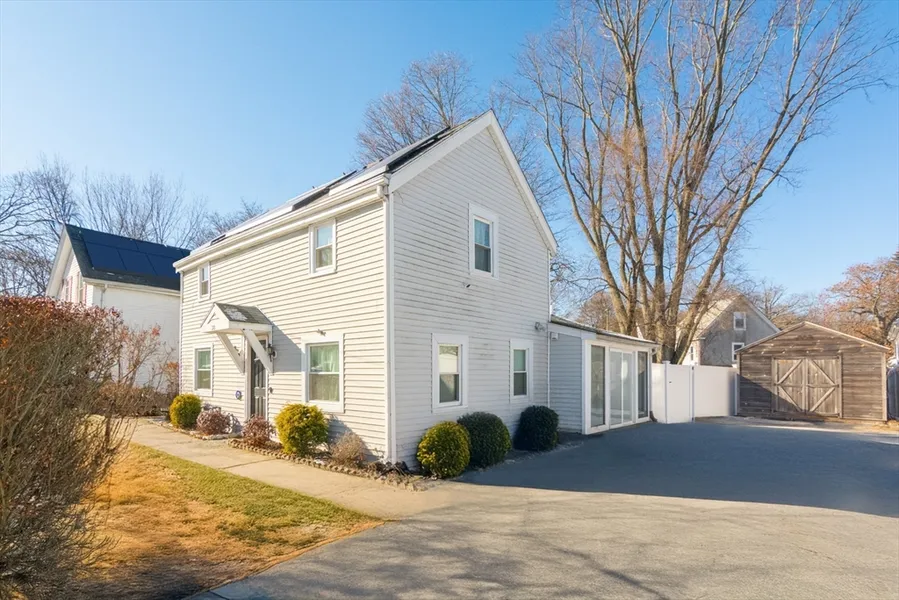 Beautifully modernized 1780 antique Colonial blending historic charm with updates. This 2-bedroom, 1.5-bath has it all. The 1st floor features an upgraded kitchen with stainless steel appliances, roomy living room with a wood burning fireplace and built in shelving from the original wood floors, a spacious dining room, half bath and a mudroom with driveway access. The second floor has vaulted ceilings and skylights throughout and offers 2 bedrooms and a modern bath with walk-in shower. Enjoy a private fenced yard with 18×11 grapevine covered pergola and patio, oversized driveway, 16×12 storage shed, newer roof and siding, and transferable solar panels. Quiet side street location close to all Dedham amenities. No showings until the first open house, Saturday, January 3rd at noon.