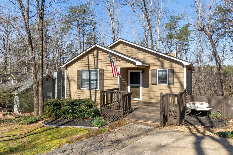 Cottage lake home with platform dock! Cute as a button and ready to move into! This cozy home features hardwood floors thru-out main level. Open beam cathedral ceiling in great room/dining area features a masonry fireplace and an accent wall of shiplap. Open and airy Kitchen w/granite counters . Full finished basement has newer carpet, bedroom/living area, huge walk in closet & full bath. Double decks overlook private wooded lot.