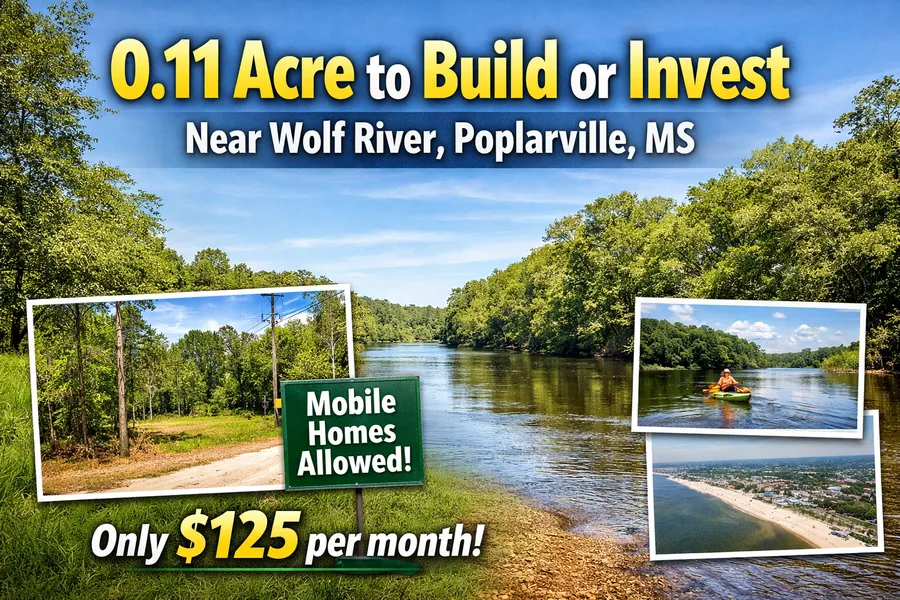 Theres nothing like stepping onto your own 0.11 acres in Poplarville, MS and feeling the quiet pride that comes with owning land. This affordable Mississippi land for sale offers road frontage, power along the street, nearby homes, and mobile homes allowed, making it a great spot to build now, farm a little, or hold as a smart land investment opportunity. Located near the peaceful Wolf River for fishing, kayaking, and relaxing weekends, youll also enjoy easy trips to Hattiesburg about 47 miles away and Gulfport around 37 miles away, giving you both privacy and real convenience. Poplarville is known for homesteading and low living costs, so your dollars go further here.