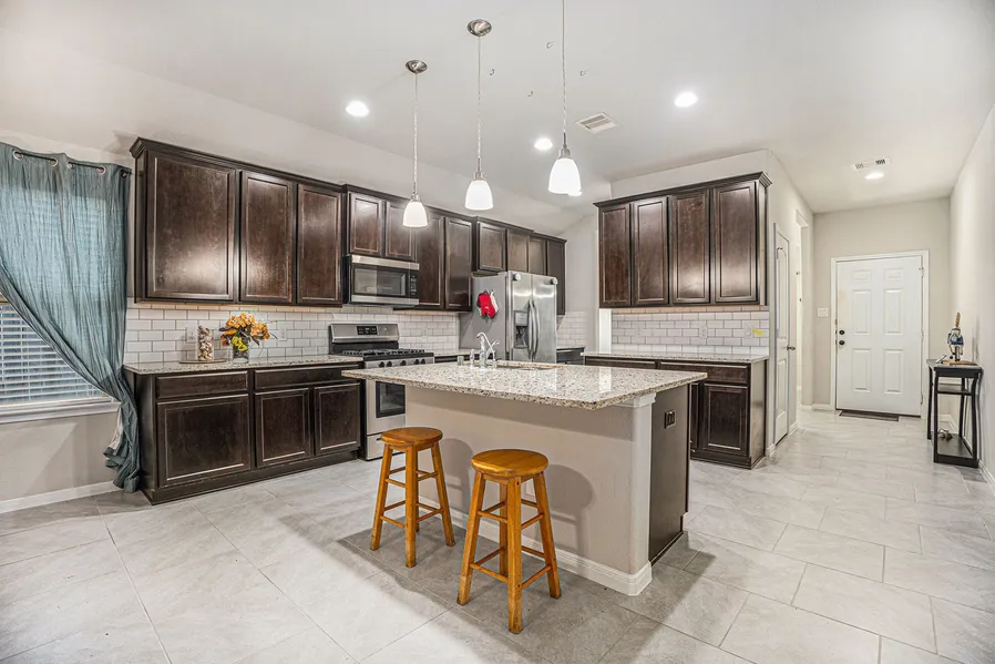 MOTIVATED SELLER ***This home checks all the boxes***NO FLOOD(x-zone)--3BR, spacious Open Concept Chefs Kitchen & Living/Family Rm. Granite counters, center island breakfast bar+pantry. Soft close drawers/cabinets. High Ceilings & Primary BR features walk-in closet, double vanity, garden size soaker tub, separate shower. Full brick surrounds home with cement board soffit/fascia+under-eave lighting in front of home. Whole house LED lighting and 2" Wood Plantation Blinds. Mature trees and landscaped front yard w/manual sprinkler system. Amenities: 12-acre Crystal Lagoon, resort-style pools, splash pad, trails, parks, restaurants, two fitness centers AND they're adding a pickleball court! Also subdivision security is all part of the resort-style living in the Lago Mar planned community. Relax with Bay Area breezes as you enjoy the white-sand beaches, swim in crystal waters or dine lagoon si...