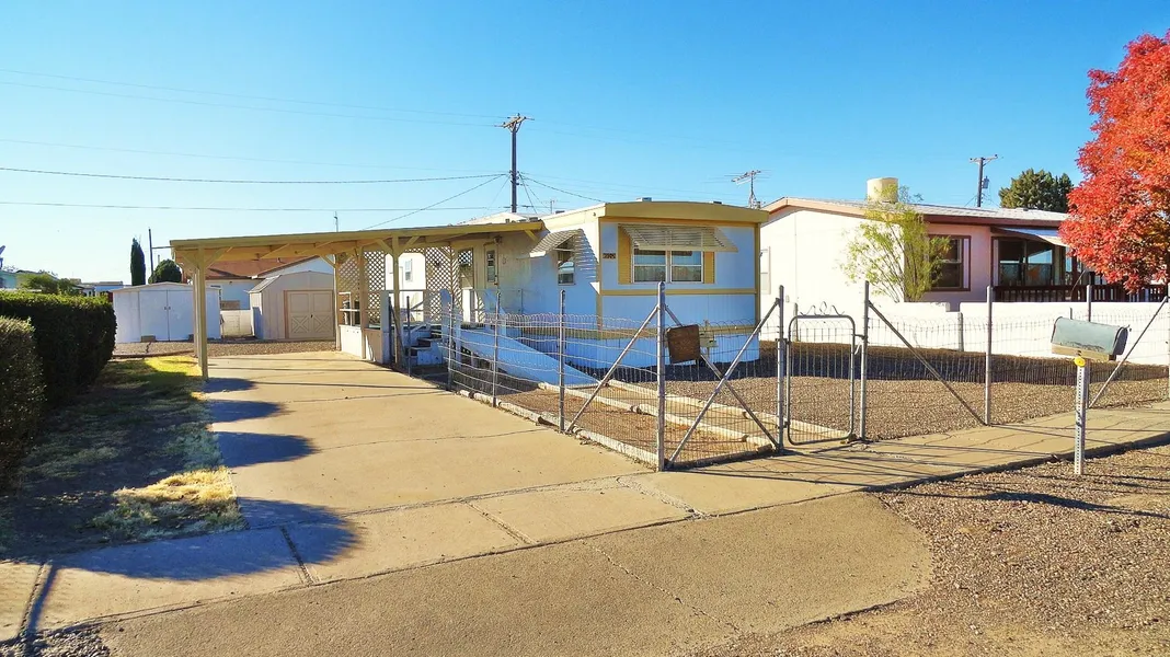 Priced to sell quickly!!! Won't last!!! Cute single wide in Deming Estates on 8th Street!! Nice dining area in front of the house with cabinets. Ramp and handicap ready. Nice sized living room. Utility room with exit. Zero landscape. Storage shed in backyard. Completely fenced. Look fast before it is sold!!!