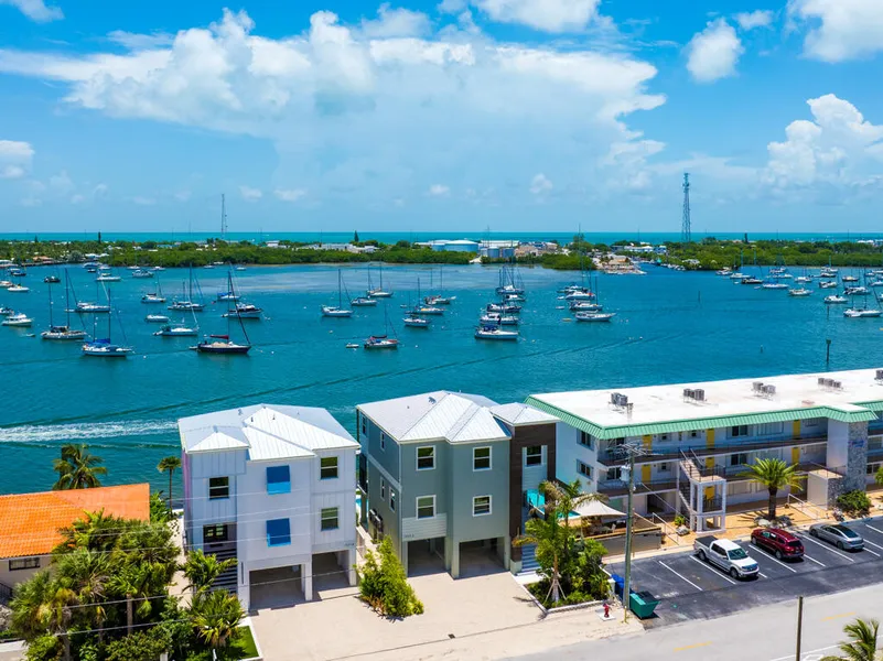Brand New 2024 CBS Construction with gorgeous Boot Key Harbor Views and excellent boating! Every detail has been considered in this turnkey pool home, boasting high-end finishes, and offering elevated Keys living in a prime location! Upon entry, the open concept Great Room is bright and spacious with soaring ceilings. The focal point of the space is a wall of impact-resistant glass doors leading out to a full-length covered veranda with custom railings and stunning Open Water Views! Entertaining is a breeze in the expertly equipped Chef's Kitchen, complete with luxurious Cambria quartz countertops and backsplash, custom soft-close wood cabinetry, and sleek Cafe appliances, including a gas range, microwave drawer, double oven, and Bertazzoni vent hood. Visitors will enjoy well-appointed accommodation in any of 4 generous guest bedrooms, boasting harbor views, or golf course views with partial views of serene Sisters Creek. Retire to an opulent primary suite, with walk-in closet and oversized windows offering sweeping views of Boot Key Harbor. Water views continue in the elegant en suite bathroom, evoking feelings of relaxation with stunning tile work, standing soaker tub, and glass shower with dual showerheads. Outside, a spacious T-dock accommodates multiple vessels for frequent and easy boating. Cool off after a day on the water in the gorgeous pool and spa with striking white marble deck and grill up your fresh catch on the spacious waterfront veranda! Plenty of parking with covered carport, and open parking in front. Just minutes to nearby grocery stores and delectable dining, but nestled within a quiet, exclusive neighborhood, this exceptional location offers the best of both worlds. This move-in ready Florida Keys Dream Home won't last long! Call to schedule a tour today.