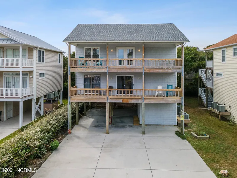 Fairytale Lane is a special part of Topsail... come see this 3 bedroom 2 1/2 bath beach home on a private, dead end street, with ocean views and a deeded community beach access. This home features an interior elevator, expansive front and back decks, and comes completely furnished so it's ready for the 2022 rental season! The reverse floorplan puts the open living areas on the top level with lots of light, vaulted ceilings, plenty of seating, and a half bath. On the lower level are three spacious bedrooms including a master suite, each with private deck access to relax and listen to the birds or the ocean. After a day on the beach, rinse the sand away in an enclosed outdoor hot and cold shower. There's lots of covered parking, a spacious storage room, and wet weather entry via the elevator. This property is in the X flood zone with its high elevation, and the current owners aren't even r...