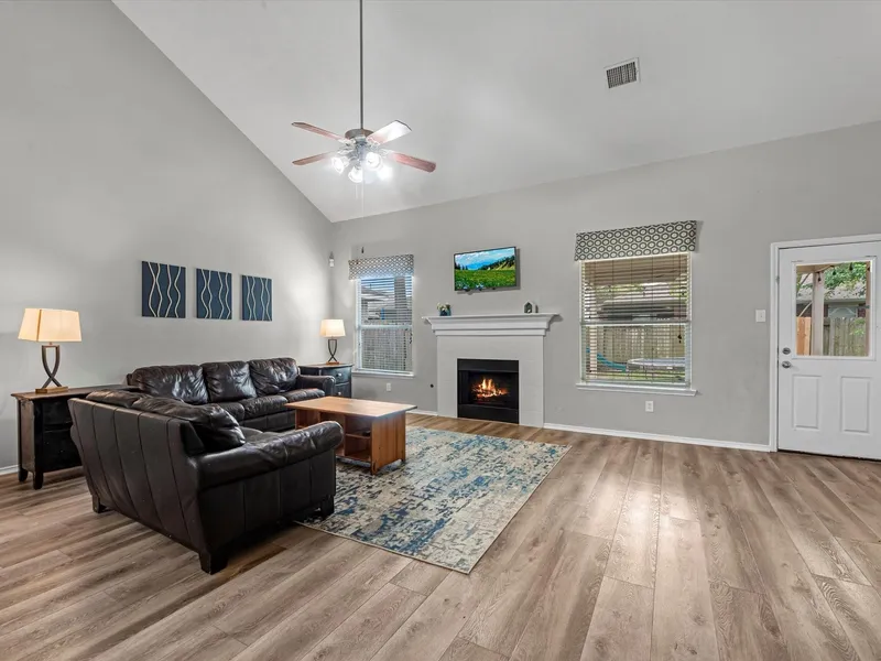 Great floorplan has open plan with pretty solid surface flooring & high ceilings! Formal dining room is up front, great for a home office, but there is another office upstairs. Island kitchen has plenty of pretty white cabinets & counter top space. Lots of room for food prep and storage! Plus a casual dining area between kitchen & family room. Large family room has high ceiling, fireplace & nice views of backyard & covered patio. Primary is down with nicely updated ensuite bath & great walk in closet! Upstairs is a terrific sized gameroom perfect for toys, games & a big screen TV. This carries the hard surface floors. Secondary bedrooms are spacious with great closets. Extra bonus room that makes a great home office or flex space. Covered patio out back is perfect for grilling and watching the kids and pets play in the back yard. Community offers pool, playground & great schools close by...