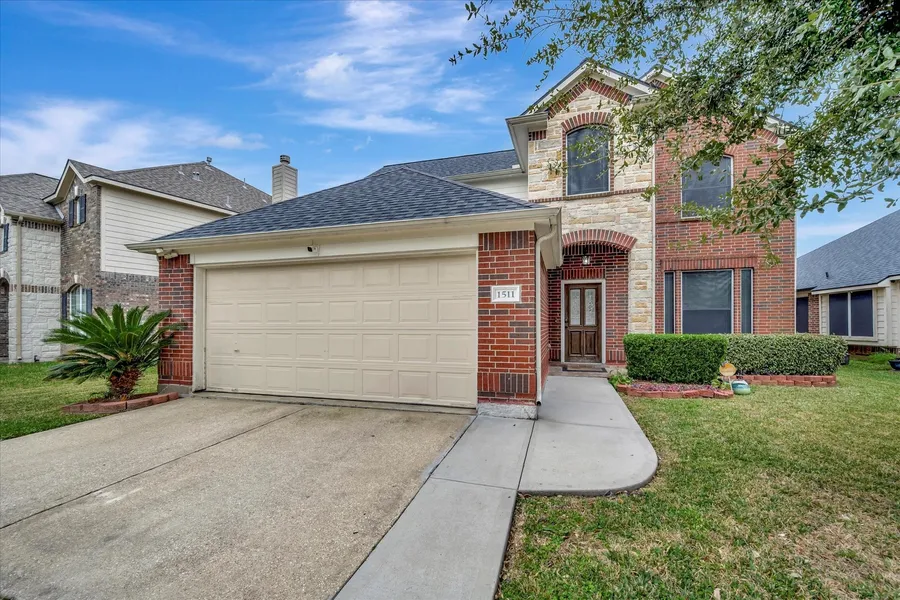 Move-in ready two-story 4-bedroom, 2.5-bath home offers a functional and spacious layout with the primary suite conveniently located on the first floor and a large game room upstairs. The inviting living area features a corner stone fireplace and flows seamlessly into an updated kitchen with granite countertops, natural stone backsplash, and a freestanding range. Tile flooring and crown molding extend throughout the entire first floor. The spacious primary suite includes double-sink vanities, a Jacuzzi tub, and a separate shower. A custom staircase with granite steps and wrought-iron railing adds a refined touch. Additional highlights include a covered patio, outdoor storage room, roof replaced in 2022, and numerous upgrades throughout. Well maintained and ready for immediate move-in.
