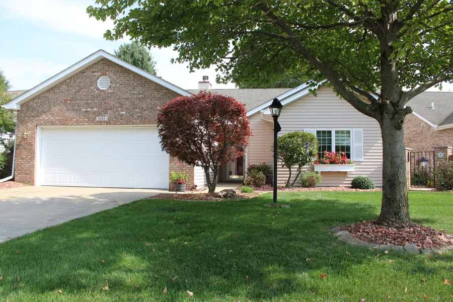 Immaculate 2-Bedroom, 2-Bath Courtyard Home in Barrington Ridge! Don't miss this beautifully maintained 1,671 sq ft brick and vinyl one-story home featuring a desirable split-bedroom layout in the sought-after Barrington Ridge community of Hobart! Step into a spacious formal living room with luxury vinyl plank flooring, soaring vaulted ceilings, a ceiling fan, and a cozy masonry gas fireplace. The formal dining room boasts elegant crown molding, chair rail accents, and a French door that opens to a charming private courtyard. The large eat-in kitchen offers an abundance of raised panel oak cabinetry, vaulted ceiling, pantry, and all appliances included. A versatile office/den with LVP flooring, ceiling fan, and double doors adds flexibility to your living space. The primary suite features LVP flooring, a ceiling fan, walk-in closet, and an updated bath with granite counters. The second bedroom also includes LVP flooring and a walk-in closet, while the second full bath showcases granite countertops. Additional highlights include a laundry room with cabinets, utility sink, and washer/dryer; an inviting 3-season enclosed rear porch with ceramic flooring, ceiling fan, and access to the paver brick patio and walkways; a finished 2-car attached garage; pull-down stairs leading to a drywalled attic w/subfloor for added storage. This exceptional home offers comfort, convenience, and character--contact your Agent and schedule your private showing today!