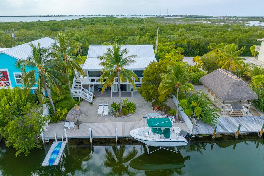 Tranquil, Waterfront Little Torch Key retreat, with excellent boating and endless views of the pristine canal and surrounding nature! This updated Jolly Roger Estates home boasts a sprawling 60' composite dock, with boat lift, kayak launch and fillet station, and no-bridge access to the Atlantic Ocean for frequent boating adventures with ease. Inside, this immaculate home is bright and inviting, with an open concept living space and soaring cathedral ceilings. Entertain for the masses with an expertly-appointed kitchen, featuring abundant storage and prep space, stainless-steel appliances including gas range, sleek quartz countertops and backsplash, and butcher block island with seating. As an added bonus, a striking wet bar, with agate stone countertops and backsplash, ice maker, wine chiller, and additional storage is the focal point of the Great Room. Grill your fresh catch and take in serene Canal Views from the spacious, screened-in porch, which spans the back of the home. Both generous bedrooms enjoy access to an open front porch overlooking a manicured front yard. The primary suite comes complete with custom storage, large walk-in closet, and luxurious en suite bathroom, with walk-in shower and custom tile work. Downstairs, a bonus storage space offers room for keeping tools and equipment out of the elements. A covered carport offers shaded parking, while the expansive front yard provides additional open parking and trailer storage. After a day on the water, relax and unwind as this immaculate lot features a large backyard surrounded by lush tropical landscaping with plenty of room to add a pool; abundantly private, this property is an ideal island oasis! Located just minutes from shops and restaurants in town, but nestled within a quiet, established neighborhood, this Little Torch Key getaway is a must-see! Call to schedule a tour today!
