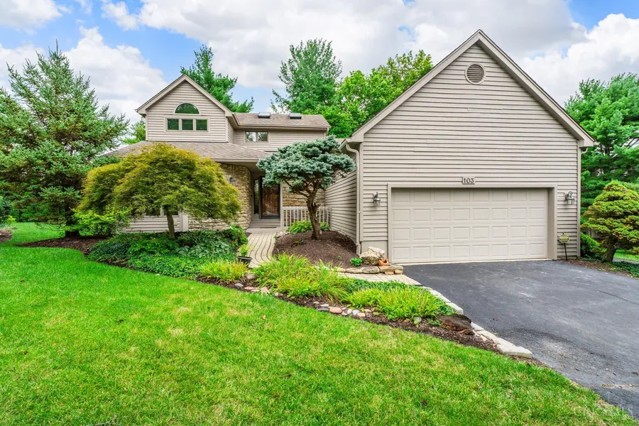 Welcome to 103 Bentwood Court, an exceptional landominium in the highly sought-after Bentwood at Carpenter's Run. This home offers three levels of thoughtfully designed living space, including three bedrooms (w/ the primary suite conveniently on the first floor), four full bathrooms, a newly finished lower level, and a two-car garage. Natural light pours in through skylights, highlighting the soaring vaulted ceilings and expansive windows in the living room for an airy, open feel. The home boasts beautiful hardwood floors, a spacious and updated kitchen, and a sleek, spa-like primary bath complete with a large shower and soaking tub. Life at Bentwood means more than just a beautiful home, you'll also enjoy community activities and top-notch amenities such as tennis and pickleball courts, plus a community pool. All this is just minutes away from Blue Ash Golf Course, Summit Park, the Blue...