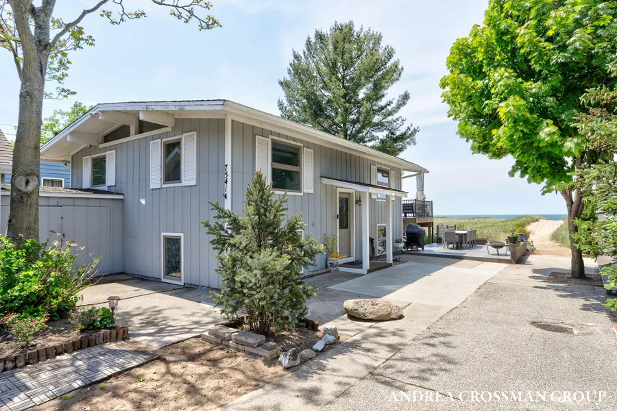 ALL OFFERS DUE by MAY 29 at noon. Discover this awesome 6-bedroom, 3-bath Lake Michigan cottage with no steps to the beach, great views, sunsets, and active, social community with optional boat dock on Pigeon Lake. The gated community of Mountain Beach is a rare offering as many homes pass from generation to generation. Large newer composite deck and large patio lakeside. No worries about erosion and enjoy driving your ''Gator'' or ATV to the beach. Just north of the Pigeon Lake channel and home is being rented this summer. Recent updates include newer LVP flooring, a 2010 furnace, a second washer/dryer hookup in the basement, and a remodeled kitchen with a center island. The main cottage has a main bedroom, full bath, and down the steps are an additional 3 bedrooms and full bath. The guest quarters above the garage include 2 bedrooms and a full bath. Rented for the summer starting June ...