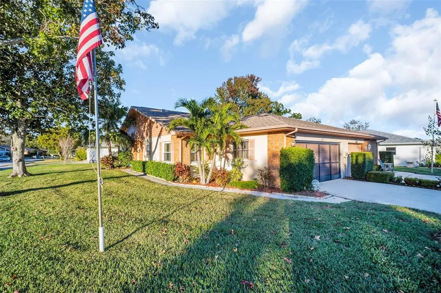 Welcome to this beautiful Duplex Village II villa located within Palm Harbor's premier 55+ golf community of Highland Lakes. This well-maintained home features an open, split-bedroom floor plan with soaring vaulted ceilings, an attached two-car garage, indoor laundry, hurricane-impact windows, a 2023 hot water heater, 2022 HVAC system, and a 2018 roof, offering peace of mind and timeless appeal. The updated kitchen boasts granite countertops, solid wood soft-close cabinetry, recessed lighting, a built-in pantry, a convenient pass-through to the dining room, and an eat-in area for casual dining. Perfectly situated on one of the community's most desirable oversized corner lots, the home offers exceptional privacy and is located in a non-flood, non-evacuation zone. The fully enclosed bonus lanai features an additional wall-unit split AC system, providing a versatile space with endless possi...