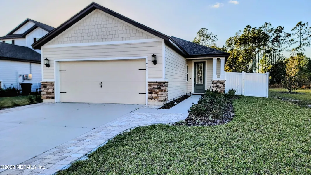 Welcome to your new rental haven in Morgan's Cove in St. Augustine where modern elegance meets comfort in this less-than-a-year-old gem! Enjoy an open floor plan, sleek quartz countertops, and luxury vinyl plank floors. The spacious kitchen boasts stainless steel appliances, soft close drawers and cabinets and an oversized California bar that opens to the living room. Park with ease in the two-car garage and on the paver extended driveway. Revel in the privacy of an end lot with no rear or side neighbors. Discover a versatile Murphy bed in one bedroom and a unique cloud ceiling in the game room/bedroom which can stay or be removed to your preference. Also includes a water softener, fully fenced private back yard and upgraded washer and dryer if needed. This meticulously designed rental is a stylish retreat in St. Augustine—schedule a viewing today to make it your home! Check out the 3D tour for a virtual walkthrough.