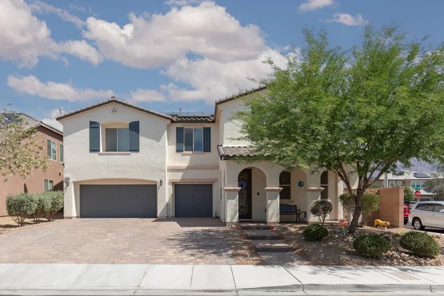 Immaculate 2 story Richmond American home located in NW on Corner lot. Home features 4 bedrooms, 3 baths, Loft + Den, beautiful heated Pool/spa. Super long driveway for a large vehicle w/ 3 car garage. This elegant, spacious home has an enormous great room downstairs, NO CARPET, beautiful ceramic tile downstairs, and luxury vinyl upstairs, including the stairs. Chef's Dream Kitchen w/HUGE island, cook top, double ovens, walk in pantry, custom cabinets, granite countertops & SS appliances. Den/Office w/french doors. Giant Loft. X-Large primary w/Gigantic walk in closet! Bath w/sep shower & Roman tub. 3 additional X-Large bedrooms. In-ground heated Pool/spa, covered patio, pavers & synthetic grass w/a view of Sheep Mtn Range. Enjoy huge savings with Solar, NV Energy bill often limited to a connection fee. New water heater & water softener.