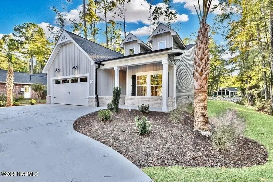 Discover a home that flawlessly blends modern sophistication with charming farmhouse elements, showcasing unparalleled craftsmanship. This stunning residence features elegant trimmed windows and doors, exquisite picture frame molding, soaring 9-foot ceilings, beadboard ceiling accents, and luxurious plank flooring. Step inside to an inviting entryway and a practical drop zone, enhanced by elegant wood shelving and a stylish brick wall accent. The living and dining areas are thoughtfully designed to create a warm and welcoming space. Chic built-ins frame the fireplace, elevating the ambiance throughout the room, with decorative lighting that creates an inviting atmosphere. The gourmet kitchen is a chef's dream, complete with a spacious deep pantry featuring wood shelving, shaker cabinetry with soft-close options, a functional island, quartz countertops, a stylish tile backsplash, and premium stainless steel appliances. Your master suite is a true retreat, boasting two generous walk-in closets with wood shelving. The master bath dazzles with a double vanity featuring vessel sinks and a luxurious zero-entry tile shower. The thoughtfully designed guest rooms and guest bath ensure that visitors feel right at home. Unwind on the back patio, a serene space designed for both privacy and an open concept lifestyle. This home also offers a finished two-car garage and ample attic storage space. The curb appeal is enhanced by a partial brick front, chic board and batten siding, shutters, exterior lighting, and functional gutters - all standard features that exceed expectations. Enjoy outstanding community amenities, including a sparkling pool, tennis courts, and a vibrant clubhouse, all supported by low association dues. Located in Calabash, the Seafood Capital of the World, you're just minutes from beautiful Sunset Beach, boat ramps, golf courses, and a variety of seafood restaurants and entertainment. Photos are of a similar home already built.