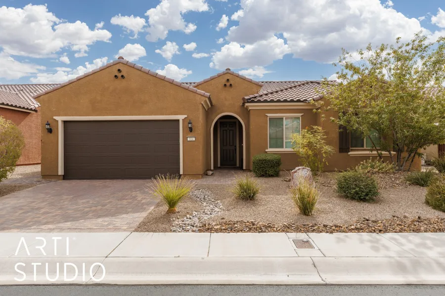 Located on a premium elevated lot with mountain views, this 2,044-sq-ft Pursuit floor plan offers 2 bedrooms, a den and 2 bathrooms. The southwest-facing backyard is set up for afternoon/evening comfort with a large covered patio overlooking a complete 5 ft deep heated pool and spa. Upgraded paver hardscaping finishes the patio, pool surround, driveway and a side path to the enclosed trash area. An oversized sliding glass door and large windows frame the views and connect the great room to the outdoors. Inside, there’s custom two-tone paint; LVP and tile in the main living areas, with carpet in the bedrooms and den. The kitchen features nutmeg-stained cabinetry, granite counters and a large island with pendant lighting. The primary suite features a bay window, large walk-in tiled shower and a spacious walk-in closet. The guest bedroom and den are well-sized and away from the primary suite; the den’s French glass doors make it an ideal flex room. The extended (26ft) garage fits trucks comfortably and includes additional storage space. The home comes with a whole-house water filtration system. Sun City Mesquite offers a clubhouse, pools, outdoor courts, miles of walking paths & more!