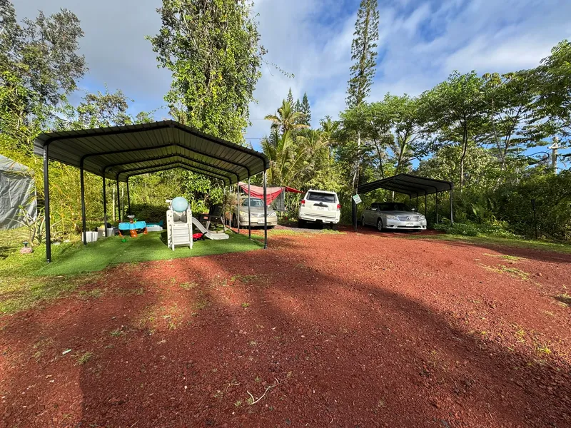 Corner lot, fronted with a large bamboo gate for privacy, the property has three new 10' x 20' canvas carports with painted raised wooden platforms. Enjoy the beautiful gardens with over fruit trees, vegetables and beautiful tropical flowers, including, but not limited to lemon, orange, papayas, pineapples, avocado, sugar cane and mango. This lot is to be sold with the adjacent lot (MLS 720292). With the purchase of both lots, you will have over 1/3 acre. This is a corner lot near the top of Diamondhead Dr. off a paved road. The lot is private with no side or back neighbors.