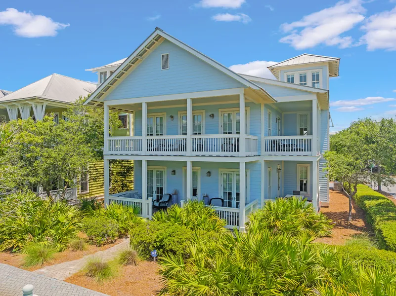 The stunning and spacious kitchen includes Cambria quartz countertops, commercial-grade Viking appliances, modern shaker-style cabinetry, a breakfast bar, and a wet bar with bar seating and a Viking beverage refrigerator and ice machine. A first-floor guest suite and half bathroom complete the first level. Upstairs, find two additional guest suites, one with a private covered balcony and the other currently used as a bunk room and a sitting room with direct access to a side porch. The serene master suite overlooks Scenic Highway 30A with a private balcony, three closets, and a lovely ensuite with separate soaking tub, dual vanities, and a large walk-in shower. The second level wet bar and laundry room provide added convenience. Head upstairs to the third-floor tower to soak in 360-degree views of the community and the Gulf of Mexico. Six covered porches in total provide additional living space and scenic views. A landing connects the main house to the carriage home which includes a separate bedroom, living space, bathroom, Juliet balcony, and kitchen with a range/oven, mini fridge, sink, and microwave. The incredible outdoor loving space features a private swimming pool, summer kitchen with sink, gas grill, and Big Green Egg, a trellis shading a lounge area complete with TV, and a cabana bathroom.
