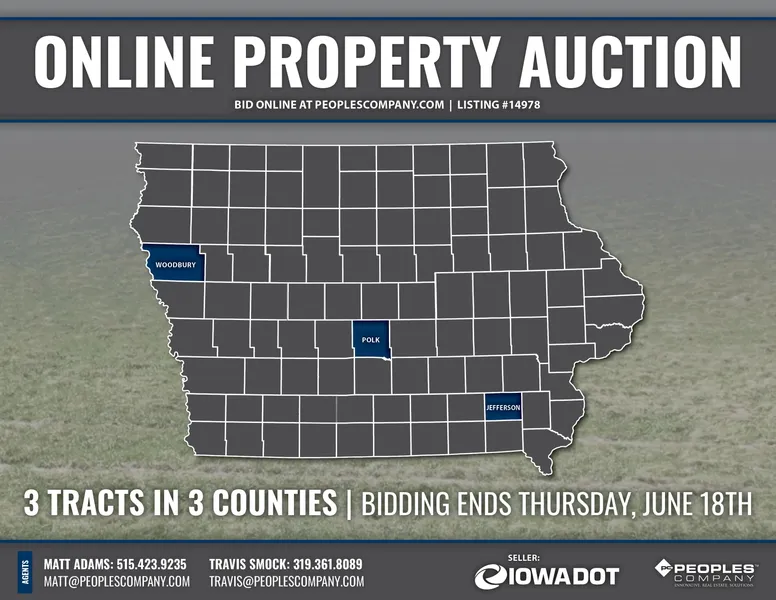 Peoples Company is offering three individual tracts owned by the Iowa Department of Transportation through an ONLINE ONLY auction where all bidding must be done online or through Peoples Companys bidding app. Bidding will be LIVE until Thursday, June 18th, 2020 at 2:00 PM Central Time Zone (CST). Closing to take place on or before Friday, July 17th, 2020. The tracts include various types of land and buildings and are located across the state of Iowa in Jefferson (Fairfield), Polk (Des Moines), and Woodbury (Moville) Counties.
