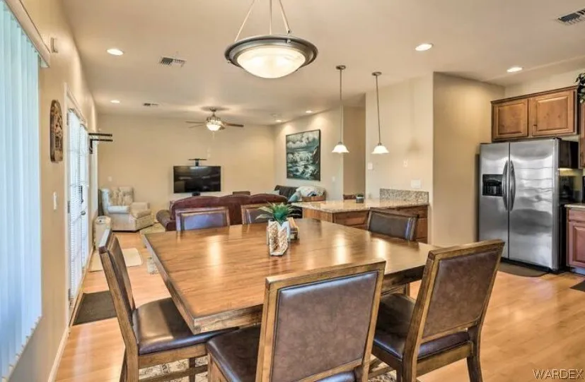 Looking for that UNIQUE & FULLY FURNISHED home/lot combo located across the street from the Colorado River? The perfect property has come available in this stunning 1021 sf, 2 bed, 2 bath home that is situated on a massive .18 acre fully fenced double lot. If you want room for expansion or room for your water & desert toys, or that family RV or travel trailer this is the property for you. Options are endless with this property that is located in the heart of Bullhead City, AZ as you can keep both parcels together & build that detached casita or RV garage as utilities have already been ran to the adjacent vacant lot, or split the lots & build a secondary home.... Whatever your vision, it can be done. This home offers plenty of paved parking out front & the finished 30(W)x38(D) 5 car garage has you covered for all of your storage needs & there is even a 1/2 bath in the garage space. Enter the main house from the side as you will notice an outdoor shower which is perfect for those river & lake days & take the tiled steps up to the main house where you will be greeted by a full-length covered patio with unobstructed sunset, mountain, & river views. This home offers an open style concept with the living room being spacious in size & featuring laminate flooring, ceiling fan, & those same great unobstructed views. The adjoined kitchen area offers granite counters, breakfast bar style seating, casual dining, stainless appliances, gas range, & plenty of cabinet space. Both bedrooms feature plush carpet, while the main bathroom has a dual vanity & tiled tub/shower combo. In house laundry facility, water softener system, solar screens, downstairs storage closet, & a fully operational smart home directly from your phone make this the perfect TURN-KEY cash flowing vacation rental, full time residence, or part time property. Located minutes to the Colorado River, Lake Mohave, Laughlin casinos, restaurants, shopping, & fun. Don't let this 1 of a kind property pass you by.... Book your appt to view it in person today!