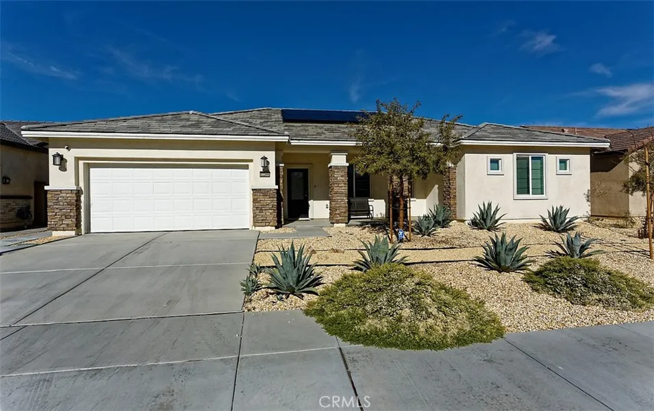 Modern single-story home built in 2022, offering 4 bedrooms, 2 baths, and approximately 2,000 sqft of well-designed living space in a desirable North Victorville neighborhood. Open-concept layout features a spacious kitchen with contemporary finishes, ample cabinetry, and seamless flow into the main living areas; ideal for entertaining and everyday comfort. Private primary suite includes ensuite bath and walk-in closet. Situated on a 7,666 sqft lot with low-maintenance desert landscaping and a two-car attached garage. Owned solar provides energy efficiency and long-term savings. Conveniently located near schools, parks, shopping, and major commuter routes. Turnkey newer construction with modern systems, ideal for buyers seeking style, efficiency, and value in Victorville.
