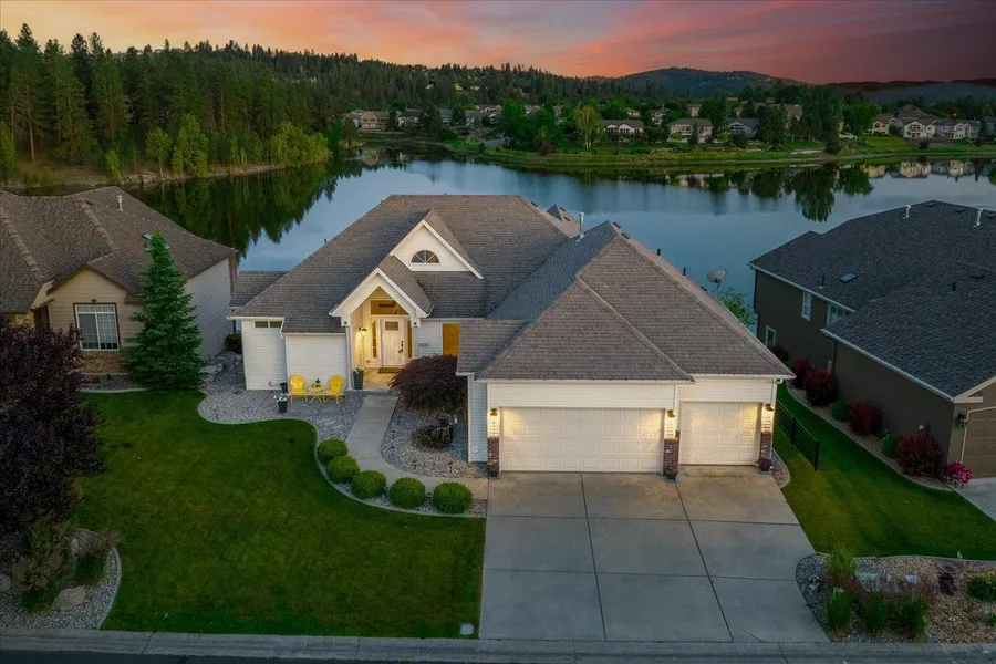 Experience retreat-style living with panoramic views of Shelley Lake and the Mica Peak Conservation Area. This home is filled with natural light, creating an airy ambiance that compliments the cathedral ceilings and oversized windows. The main floor features a spacious kitchen that flows into an open-concept family and dining room, enhanced by a cozy gas fireplace. Downstairs has the same light and airy feel with high ceilings, lots of windows, a second kitchen, ample storage, and a sliding glass door leading to the covered back patio. The fenced backyard is landscaped perfectly for low maintenance and color all year around. Embrace the tranquility of lake living, with access to the lake trail, paddle boarding, and fishing. Minutes from restaurants, shopping, schools, and outdoor recreation. This lakeside retreat effortlessly combines tranquility with convenience.