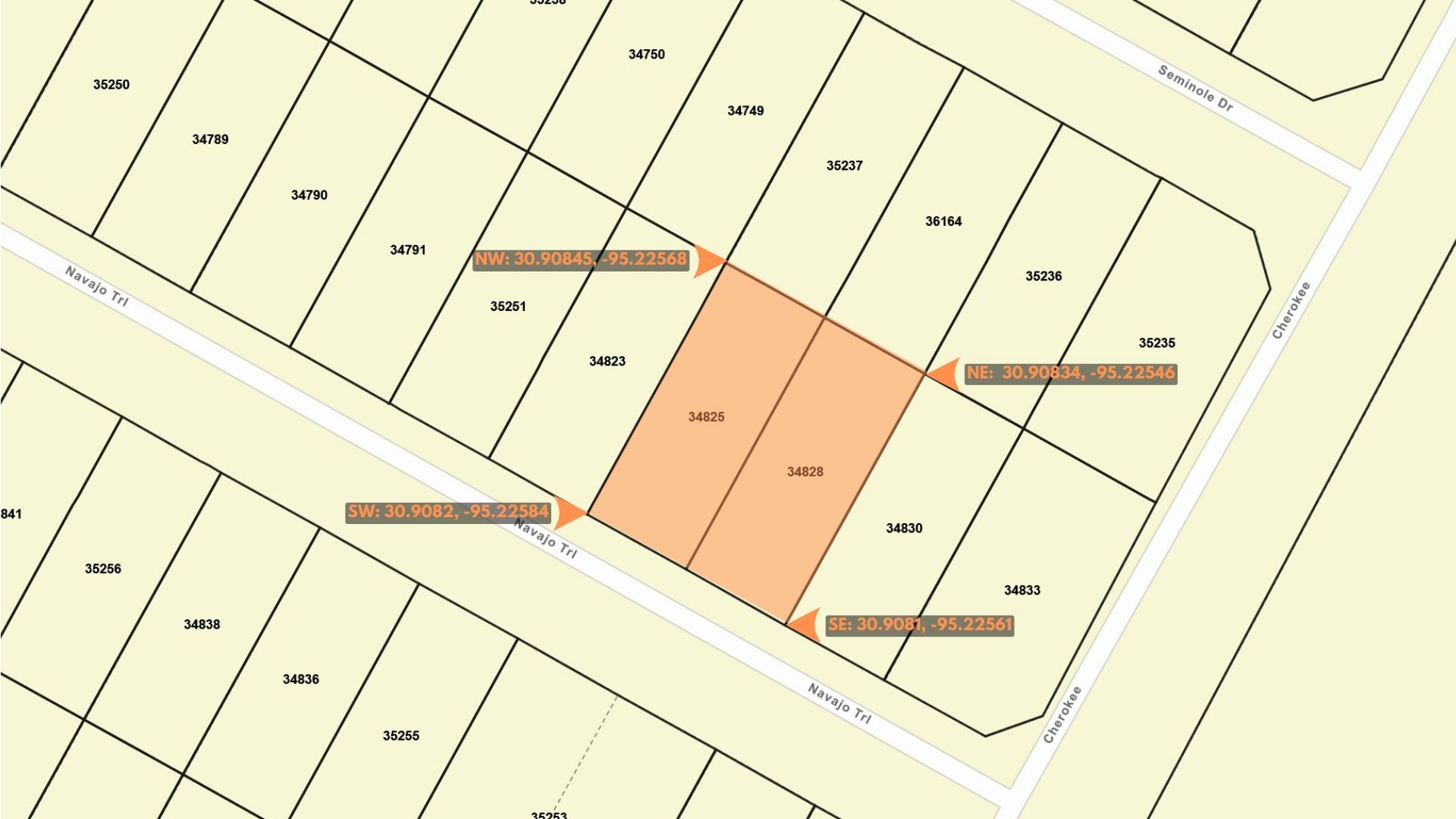 Research Parcel InformationTo visit this 0.18-acre Double lot for sale in Trinity TX, search Navaho Trail, Trinity, Texas, 75862 within Trinity County on your phone. When you are near the land, search 30.9082, -95.22584 on Google Map to locate one of the corners. Contact our office for surveys (if available), county plat maps, Google Map boundaries and corners, and MapRight