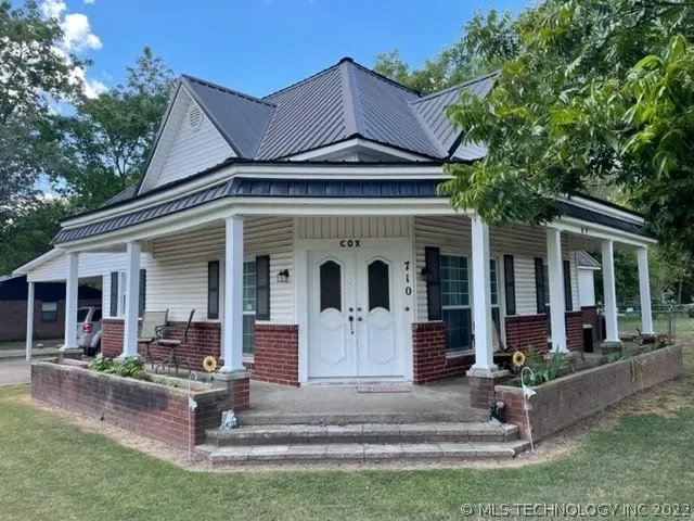 Attractive 2 Story home sitting on a corner fenced lot in the town of Warner. Large wraparound covered porch, 2 car attached carport, metal roof, patio area for a firepit and large storm shelter. Formal living and dining room, den, bar top seating in kitchen, plenty of storage in the laundry room. Fresh paint in kitchen, laundry and new flooring in dining room. Oversized master bedroom with his and her closets features a remodeled master bath (shower only). Upstairs has one spacious bedroom.